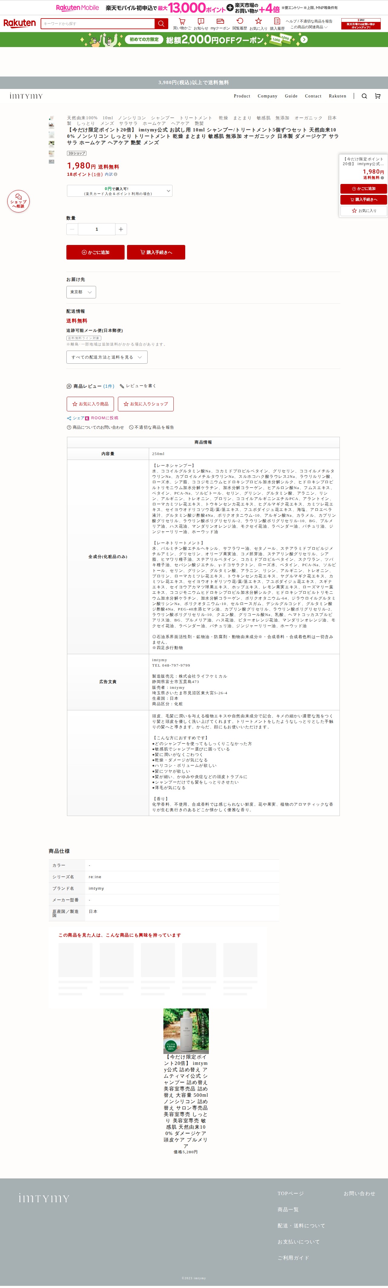 【楽天市場】【今だけ限定ポイント20倍】 imtymy公式 お試し用 10ml シャンプー/トリートメント5個ずつセット 天然由来100% ノンシリコン しっとり トリートメント 乾燥 まとまり 敏感肌 無添加 オーガニック 日本製 ダメージケア サラサラ ホームケア ヘアケア 艶髪 メンズ:imtymy 楽天市場店 - 保存されたスクリーンショット