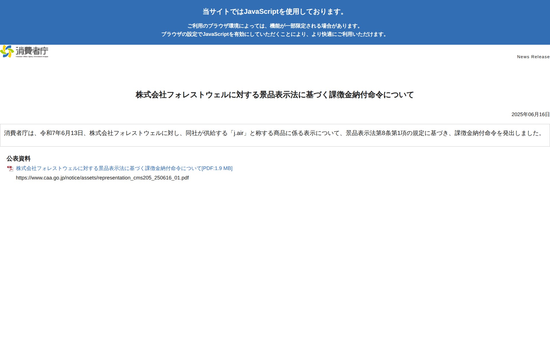 このページは、消費者庁が2025年6月13日に株式会社フォレストウェルに対して発出した景品表示法に基づく課徴金納付命令についての通知です。同社が供給する「j.air」という商品の表示が景品表示法第8条第1項の規定に違反していたため、課徴金納付命令が命じられました。詳細は公表資料のPDFで確認できます。