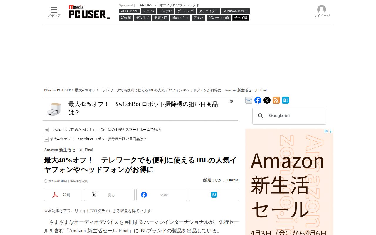 最大40%オフ! テレワークでも便利に使えるJBLの人気イヤフォンやヘッドフォンがお得に:Amazon 新生活セール Final - ITmedia PC USER