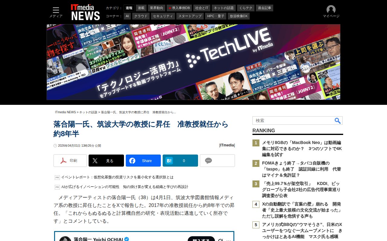 このページは、メディアアーティストの落合陽一氏(38)が2026年4月1日付で筑波大学図書館情報メディア系の教授に昇任したことを報じている。2017年の准教授就任から約8年半での昇任である。落合氏は2015年に同大で助教としてデジタルネイチャー研究室を立ち上げ、同大の「デジタルネイチャー開発研究センター」のセンター長を務めている。教授昇任後も、東京大学大学院の教員職や他大学での兼任は継続する。氏は研究者としてだけでなく、経営者やアーティストとしても活躍し、2025年大阪・関西万博ではテーマ事業プロデューサーを務めた。