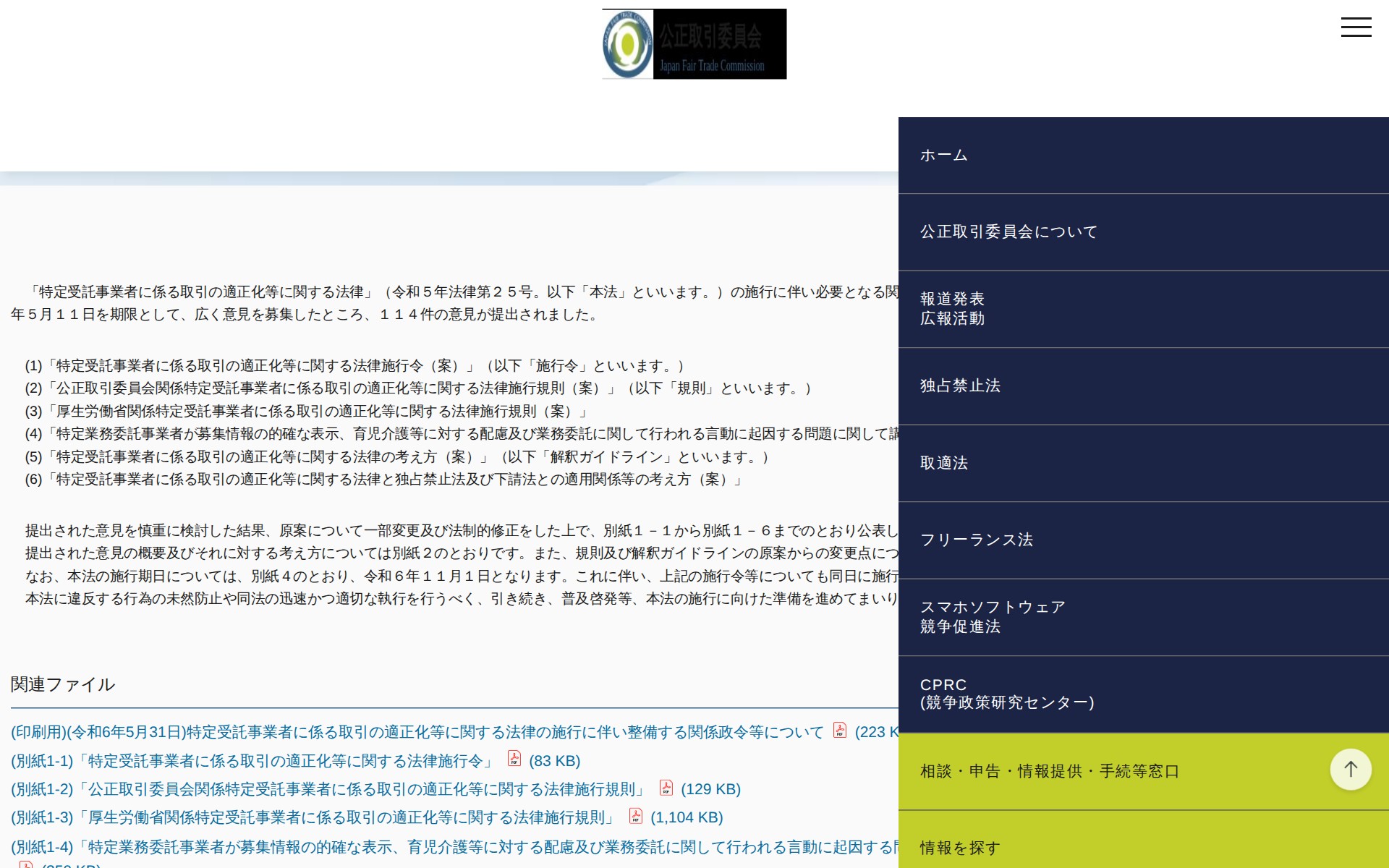 (令和6年5月31日)特定受託事業者に係る取引の適正化等に関する法律の施行に伴い整備する関係政令等について | 公正取引委員会 - 保存されたスクリーンショット