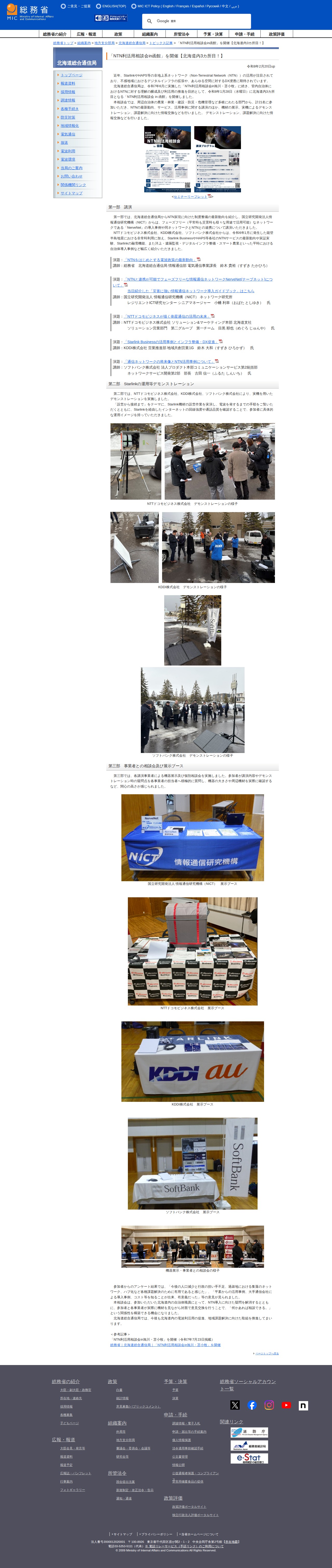 このページは、総務省北海道総合通信局が2024年1月28日に函館で開催した「NTN利活用相談会」について報告しています。Starlinkなどの非地上系ネットワーク(NTN)の活用が注目される中、北海道内3カ所目となる本相談会には、農業・林業・建設・防災など多岐にわたる部門から21名が参加しました。講演ではNTNの制度整備、NerveNetの導入事例、各通信事業者によるStarlink Businessなどのサービス紹介、能登半島地震での活用例、スマート農業などの自治体導入事例が紹介されました。また、Starlink機材の設営から接続までの実機デモンストレーションと、事業者との個別相談が行われました。