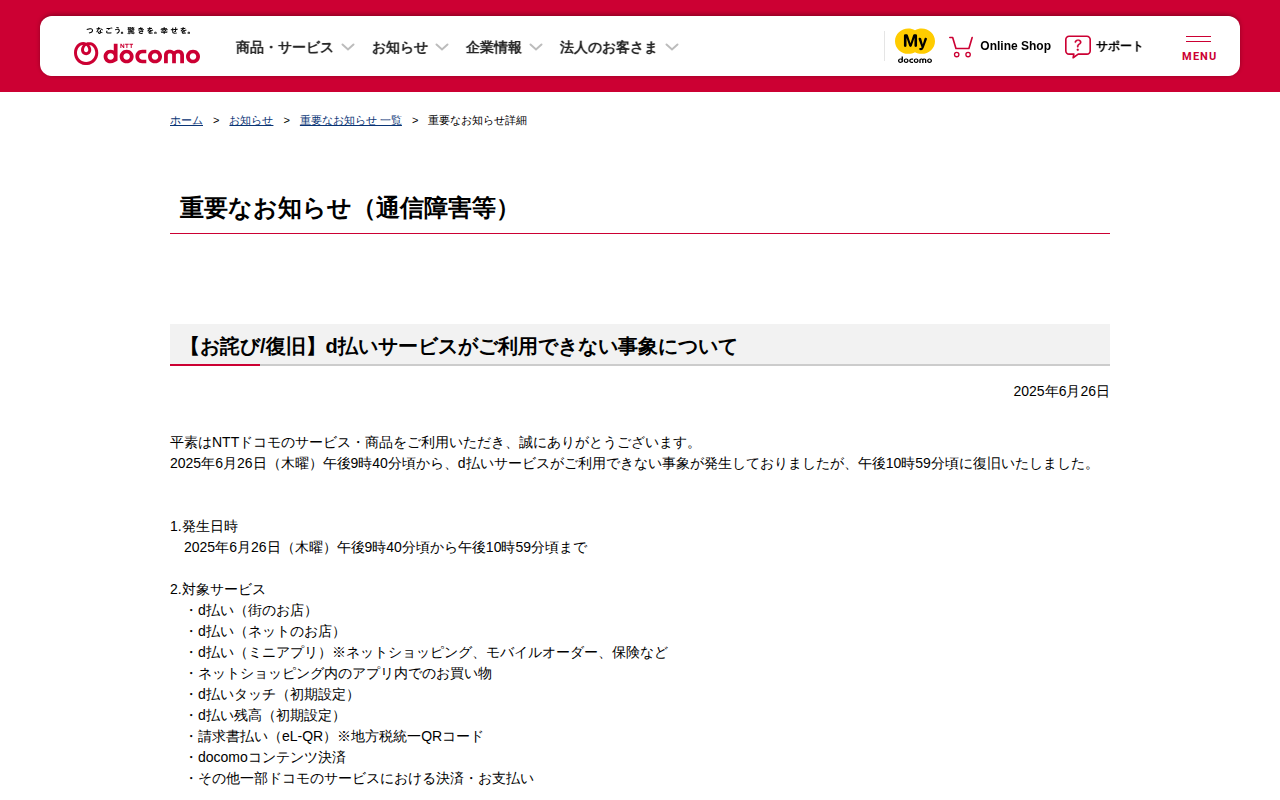 重要なお知らせ(通信障害等) : 【お詫び/復旧】d払いサービスがご利用できない事象について | お知らせ | NTTドコモ