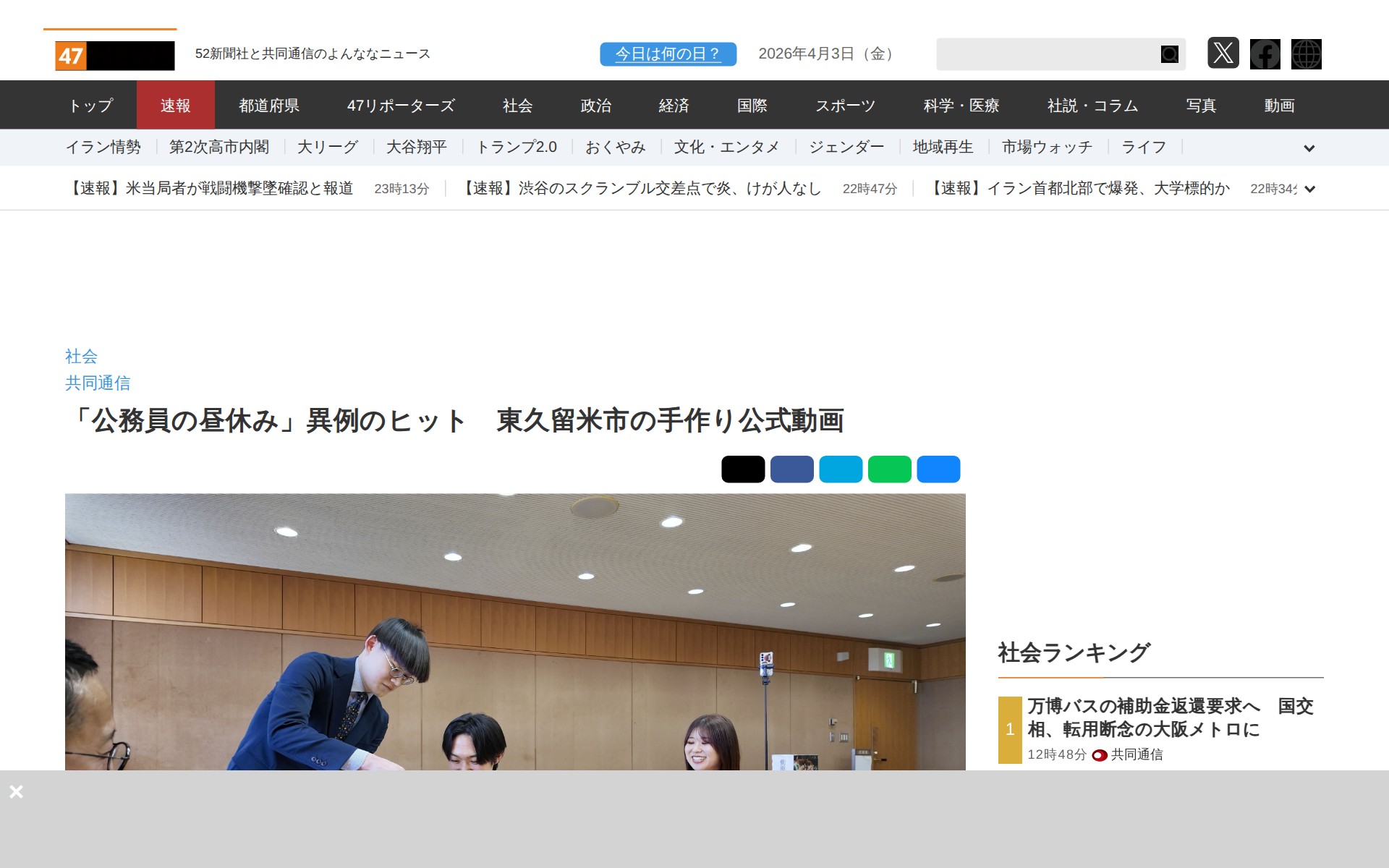 「公務員の昼休み」異例のヒット 東久留米市の手作り公式動画|47NEWS(よんななニュース) - 保存されたスクリーンショット