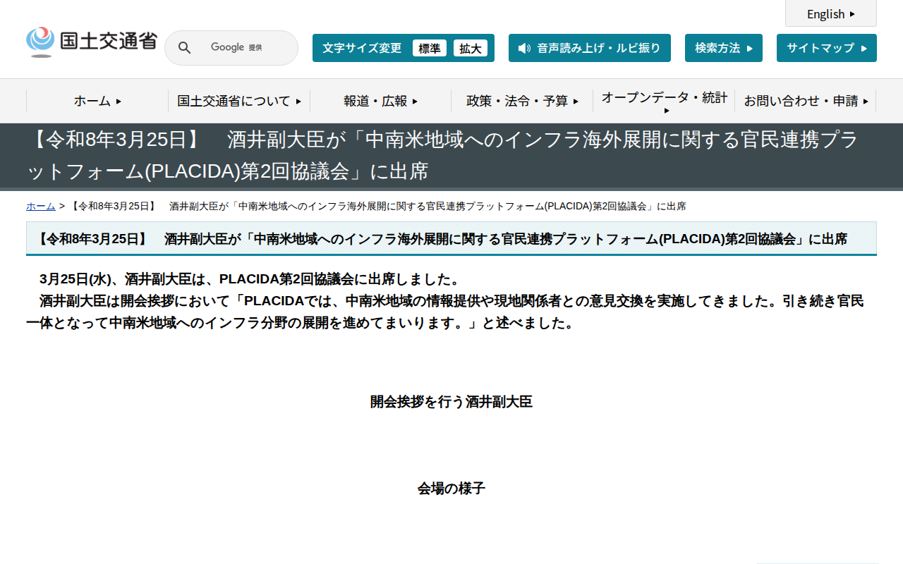【令和8年3月25日】 酒井副大臣が「中南米地域へのインフラ海外展開に関する官民連携プラットフォーム(PLACIDA)第2回協議会」に出席 - 国土交通省 - 保存されたスクリーンショット