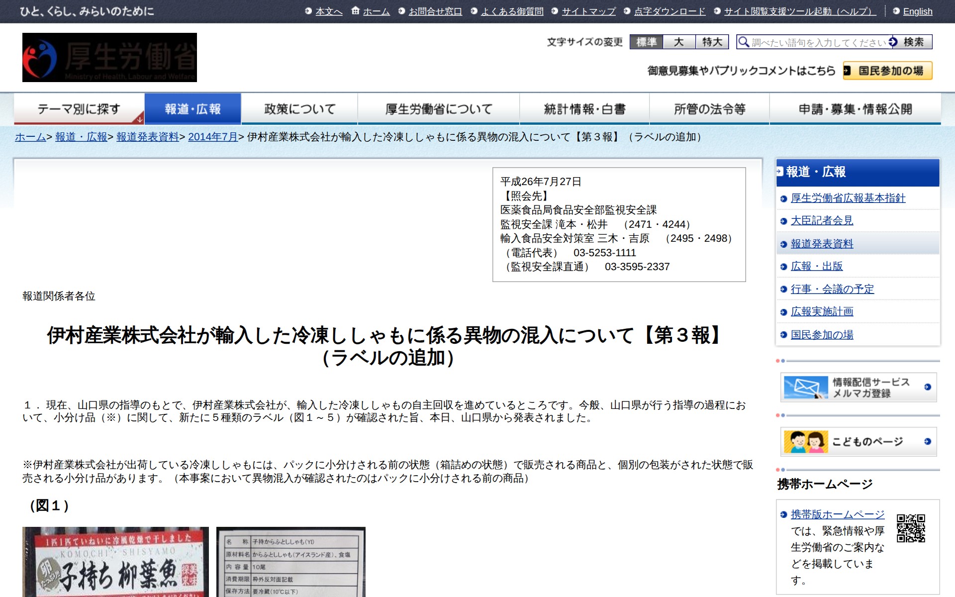 伊村産業株式会社が輸入した冷凍ししゃもに係る異物の混入について【第3報】 (ラベルの追加) |報道発表資料|厚生労働省