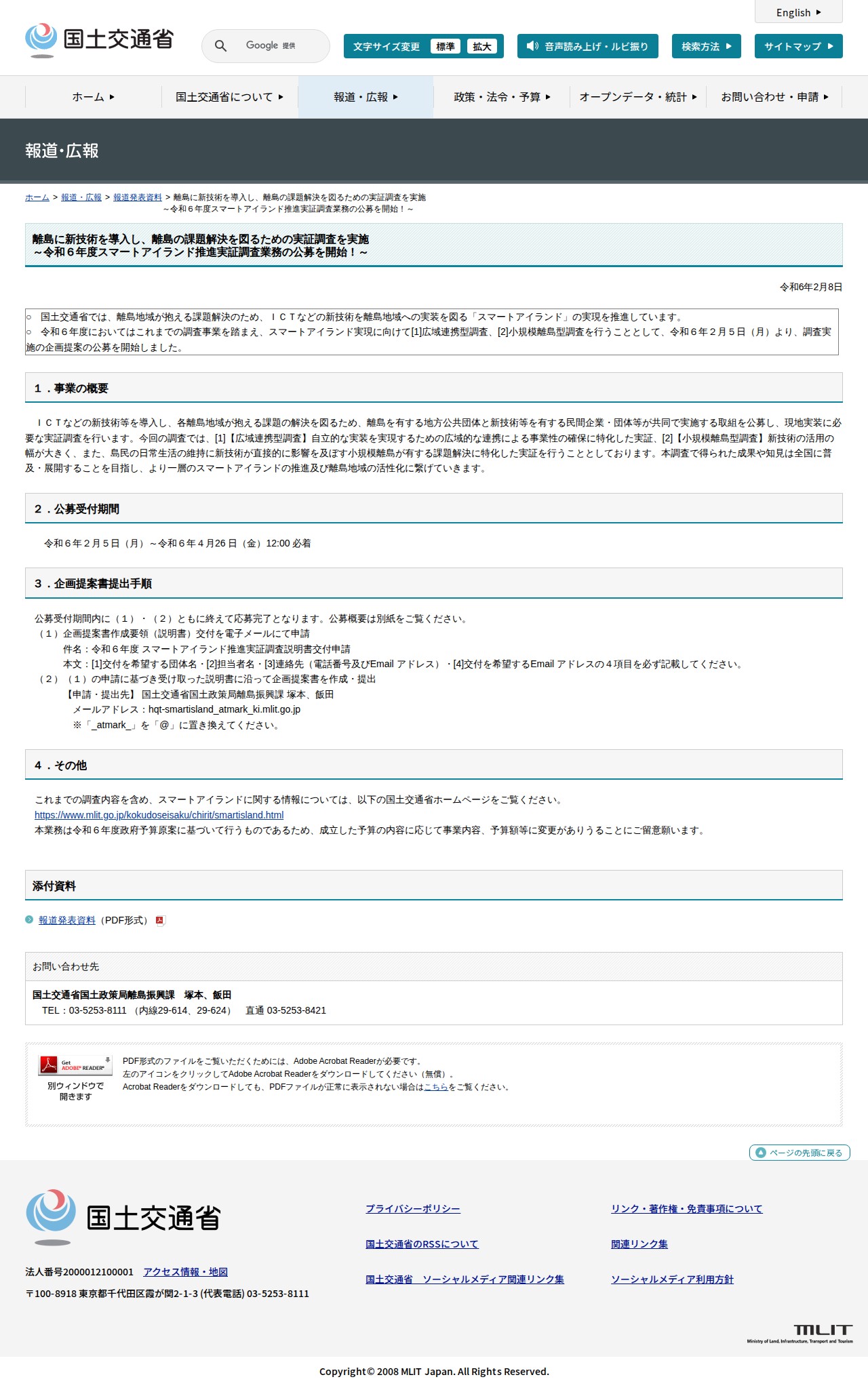 このページは、国土交通省が令和6年度に実施するスマートアイランド推進実証調査業務の公募を開始することを発表しています。ICTなどの新技術を離島地域に導入し、課題解決を図る取組を支援します。公募は広域連携型調査と小規模離島型調査の2種類で、2月5日から4月26日まで受け付けます。離島を有する地方公共団体と民間企業・団体が共同で実施する企画提案を募集し、現地実装に向けた実証調査を行う予定です。得られた成果は全国に普及・展開し、離島地域の活性化につなげることを目指しています。