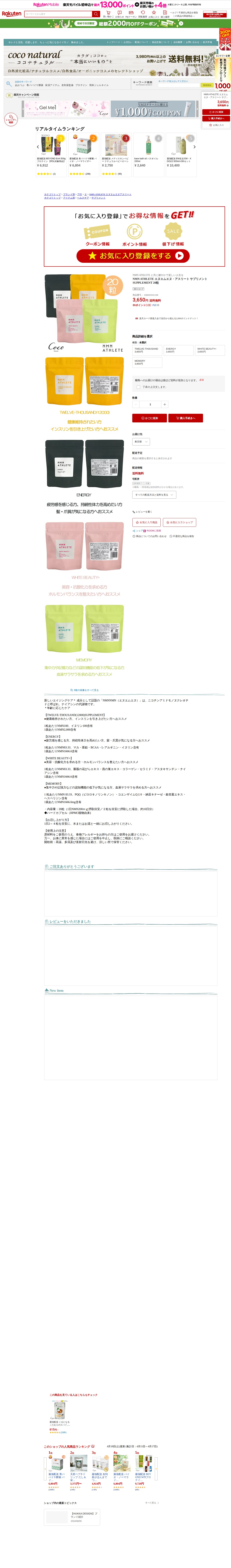 このページは、楽天市場で販売されているNMN ATHLETEサプリメント20粒の商品ページです。NMNはニコチンアミドモノヌクレオチドで、新しいエイジングケア成分として注目されています。4種類の製品が提供されており、TWELVE-THOUSAND(NMN2,000mg含有)は健康維持向け、ENERGYは疲労感や体力向上向け、WHITE BEAUTY+は美容・抗酸化力向け、MEMORYは認知機能向けです。1日2~4粒の摂取が目安で、価格は3,650円、送料無料です。