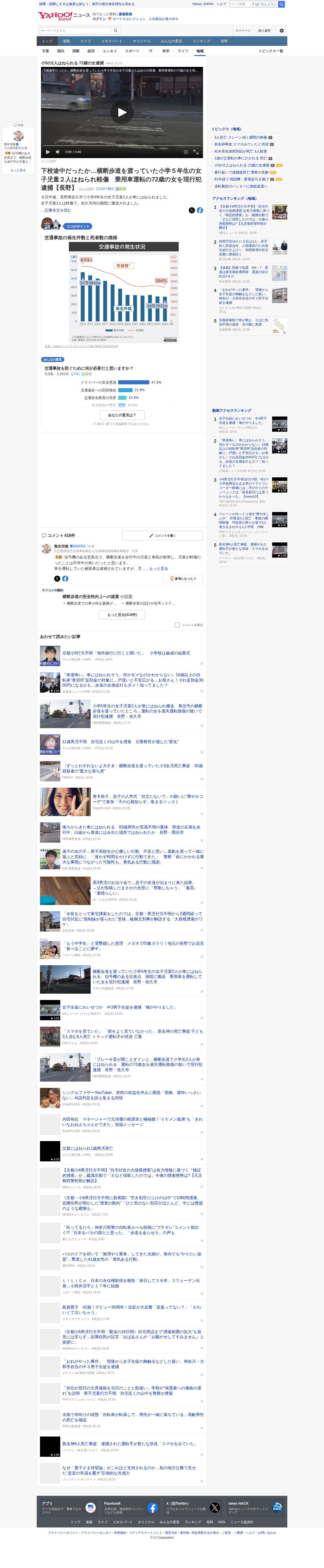 このページは、長野県佐久市で発生した交通事故を報じています。4月8日午後、信号機のある交差点の横断歩道を渡っていた小学5年生の女子児童2人が、乗用車にはねられました。児童2人は軽傷で病院に搬送されました。車を運転していた72歳の女は過失運転致傷の疑いで現行犯逮捕されています。ページでは交通事故防止に関する世論調査も掲載しており、ドライバーの安全意識向上が最も重要だと考える人が約47%となっています。