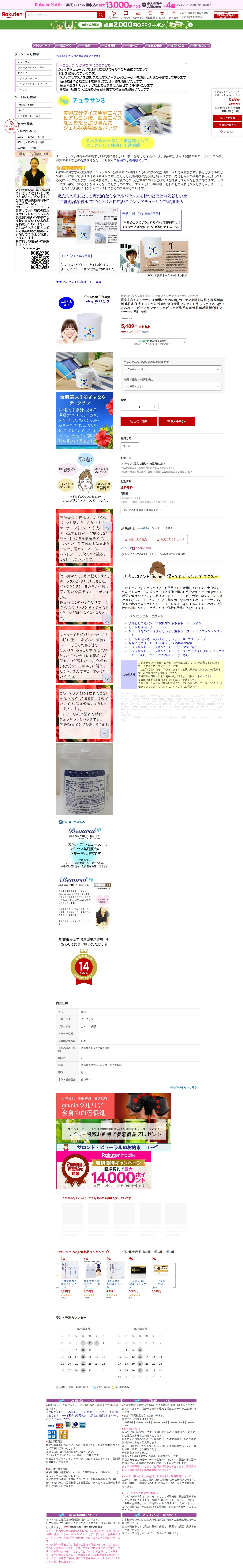 このページは、楽天市場で販売されているチュラサン3 保湿パック(500g)の商品紹介ページです。沖縄海洋深層水を使用した保湿パックで、ダイズ発酵エキス、ヒアルロン酸、海藻エキスなどの美容成分を含んでいます。洗顔後に顔全体に塗り、15~30分置いて使用します。敏感肌やアトピー肌の人でも使用でき、日焼け後のほてりや毛穴引き締めにも効果的です。価格は5,489円(送料無料)で、プレゼント付きです。レビューでは毛穴引き締めや赤みの軽減効果が報告されています。
