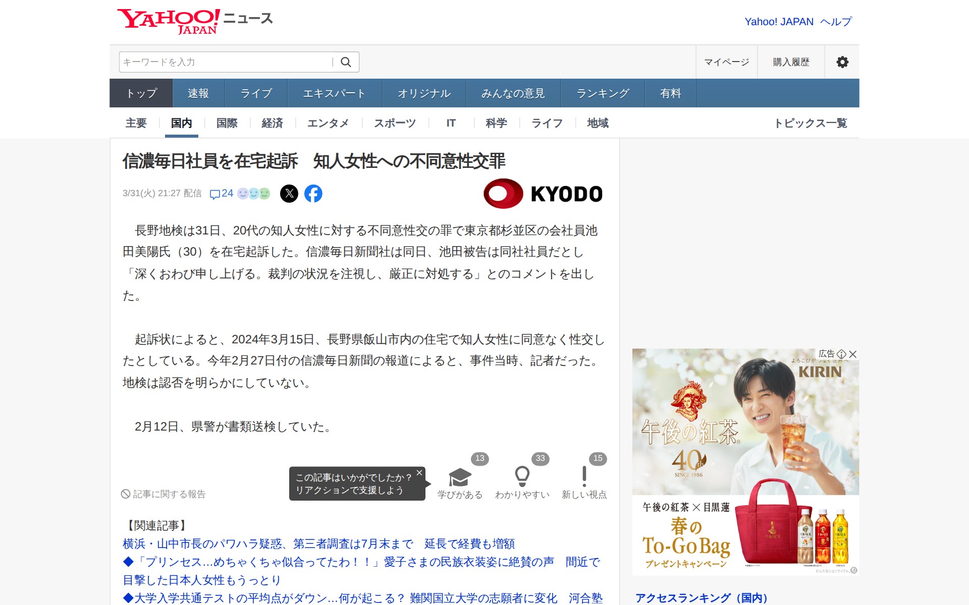 このページは、信濃毎日新聞社の社員である池田美陽氏(30)が、2024年3月15日に長野県飯山市内で知人女性に対し同意なく性交したとして、不同意性交罪で在宅起訴されたことを報じている。長野地検が3月31日に起訴した。信濃毎日新聞社はコメントで謝罪し、裁判の状況を注視して厳正に対処すると述べた。県警は2月12日に書類送検していた。