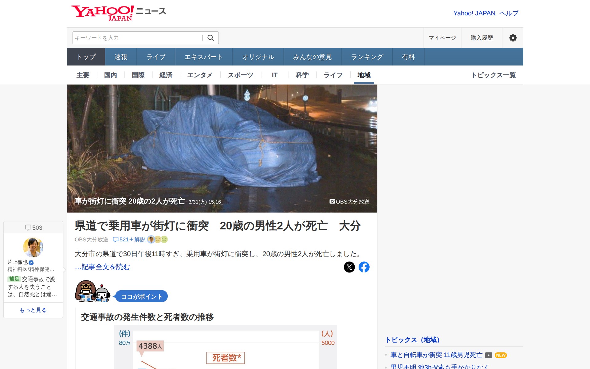 このページは、大分市の県道で発生した交通事故のニュースを報道しています。2024年3月30日午後11時過ぎ、乗用車が街灯に衝突し、20歳の男性2人が死亡しました。ページでは交通事故の発生件数と死者数の推移グラフを掲載し、読者アンケートで「交通事故を防ぐために何が必要か」を調査。ドライバーの安全意識向上が45.1%で最多回答です。また、コメント欄では過度なスピードの危険性や、高速性能の高い車販売との矛盾、速度制限機能の必要性などについて議論されています。
