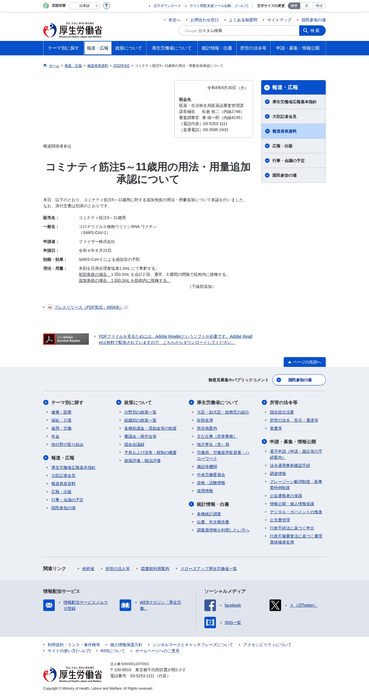 コミナティ筋注5~11歳用の用法・用量追加承認について|厚生労働省