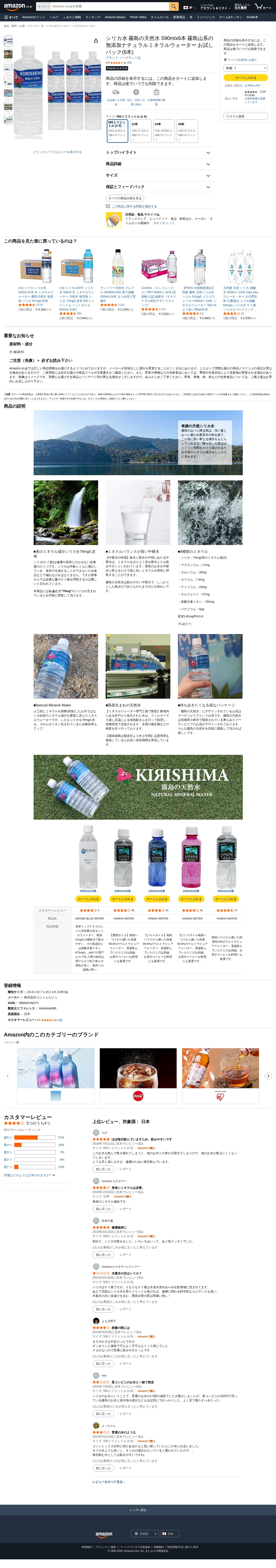 このページは、Amazonで販売されている霧島山系産のシリカ水商品です。590ml×6本のお試しパックで、無添加のナチュラルミネラルウォーターです。ブランドはノーブランド品で、出品者はLe BRILLANTです。星4つの評価を得ており、29件のレビューがあります。12本、24本、48本のオプションも用意されています。関連商品として、同じシリカ水の異なるサイズやブランド、他のミネラルウォーターが紹介されています。