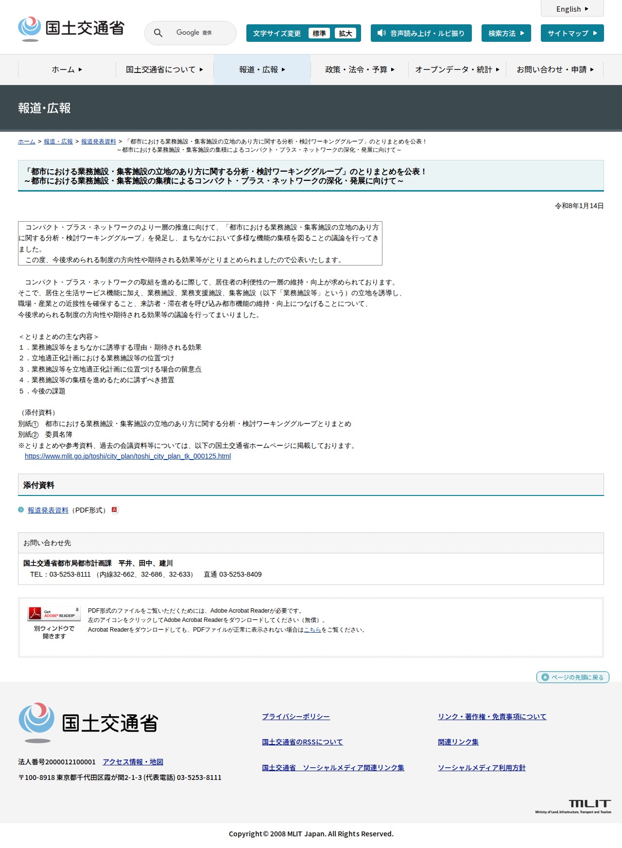 報道発表資料:「都市における業務施設・集客施設の立地のあり方に関する分析・検討ワーキンググループ」のとりまとめを公表!<BR>~都市における業務施設・集客施設の集積によるコンパクト・プラス・ネットワークの深化・発展に向けて~ - 国土交通省 - 保存されたスクリーンショット