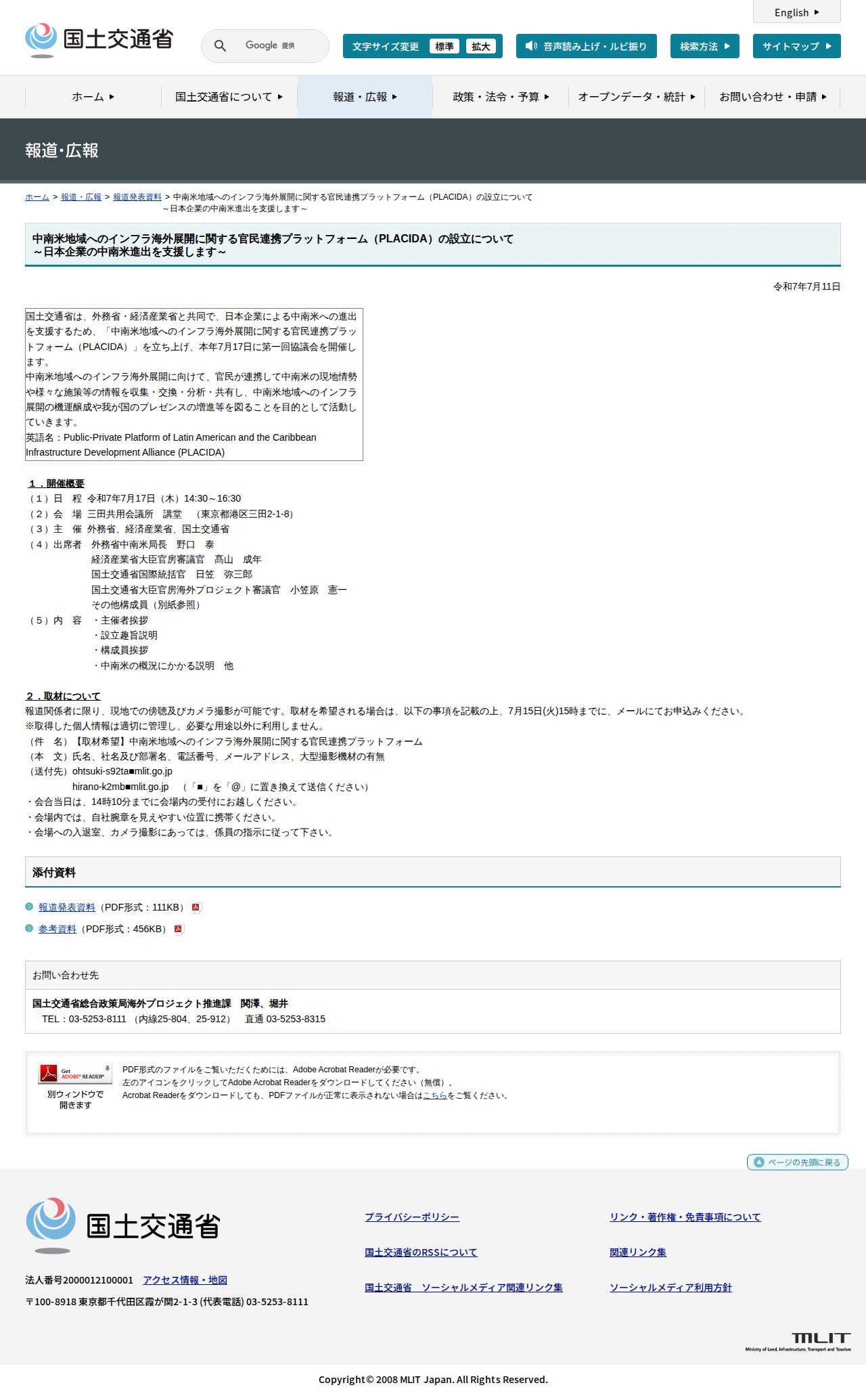 報道発表資料:中南米地域へのインフラ海外展開に関する官民連携プラットフォーム(PLACIDA)の設立について<br>~日本企業の中南米進出を支援します~ - 国土交通省 - 保存されたスクリーンショット