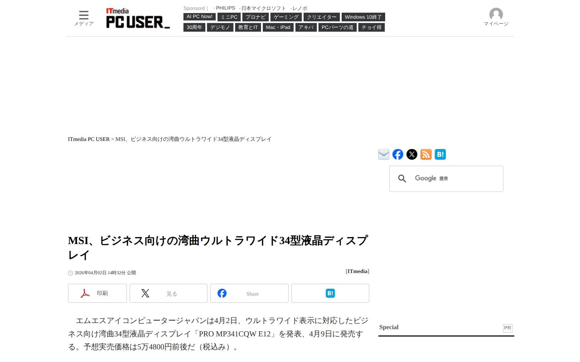 MSI、ビジネス向けの湾曲ウルトラワイド34型液晶ディスプレイ - ITmedia PC USER