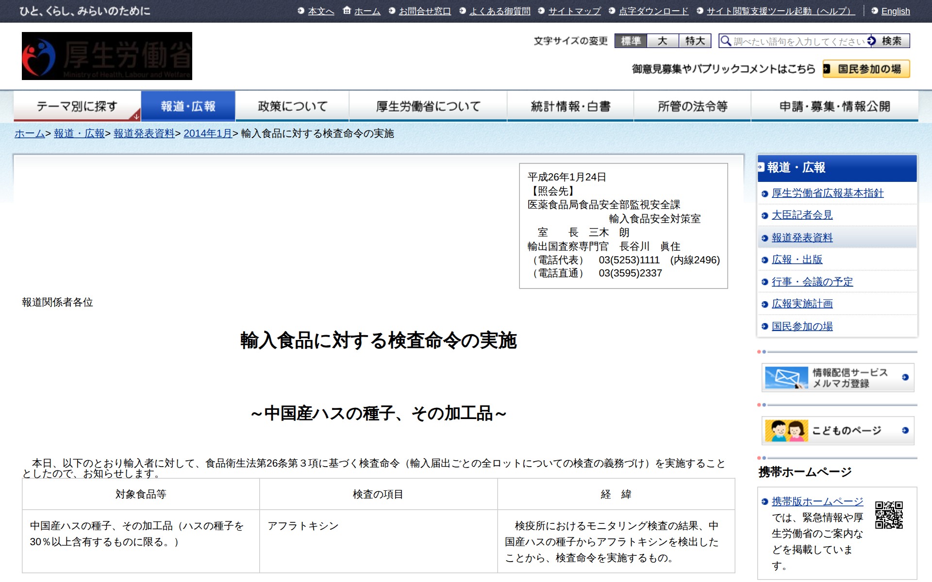 輸入食品に対する検査命令の実施 |報道発表資料|厚生労働省