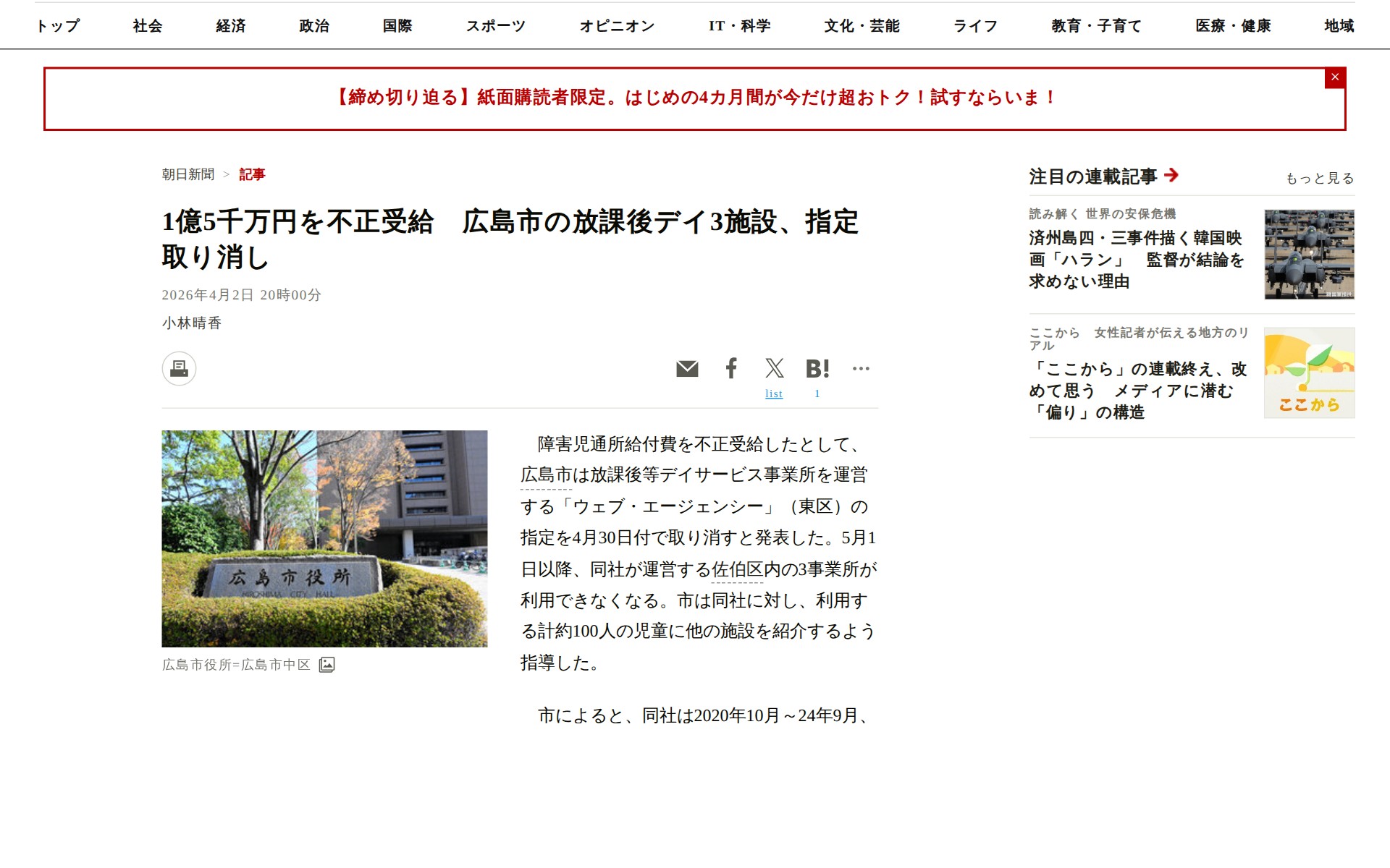 1億5千万円を不正受給 広島市の放課後デイ3施設、指定取り消し [広島県]:朝日新聞 - 保存されたスクリーンショット