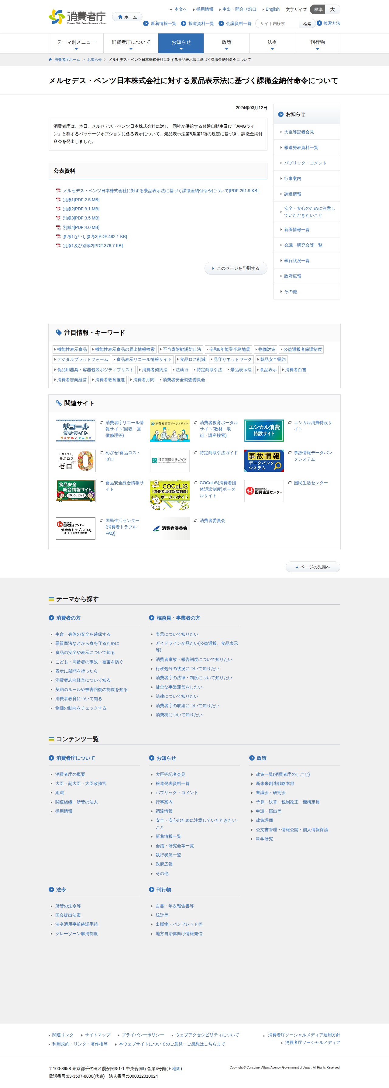 このページは、消費者庁がメルセデス・ベンツ日本株式会社に対して景品表示法に基づく課徴金納付命令を発出したことを報告する公式発表です。同社が供給する普通自動車および「AMGライン」と称するパッケージオプションの表示について、景品表示法第8条第1項の規定に違反したため、課徴金納付命令が2024年3月12日に発出されました。詳細な内容は複数の添付資料で公開されています。