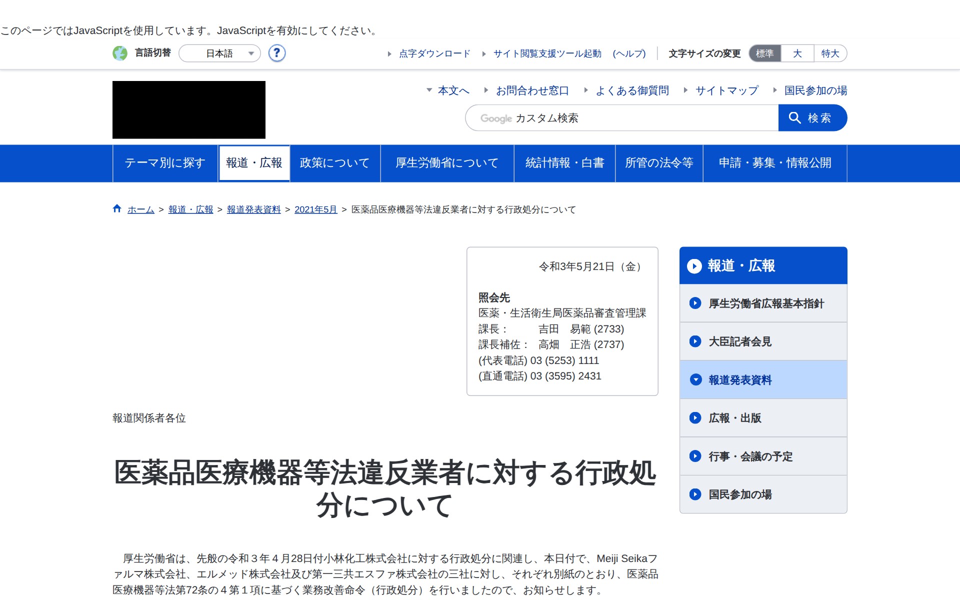 医薬品医療機器等法違反業者に対する行政処分について|厚生労働省