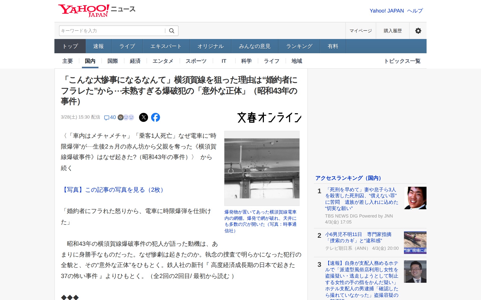 「こんな大惨事になるなんて」横須賀線を狙った理由は“婚約者にフラレた”から⋯未熟すぎる爆破犯の「意外な正体」(昭和43年の事件)(文春オンライン) - Yahoo!ニュース
