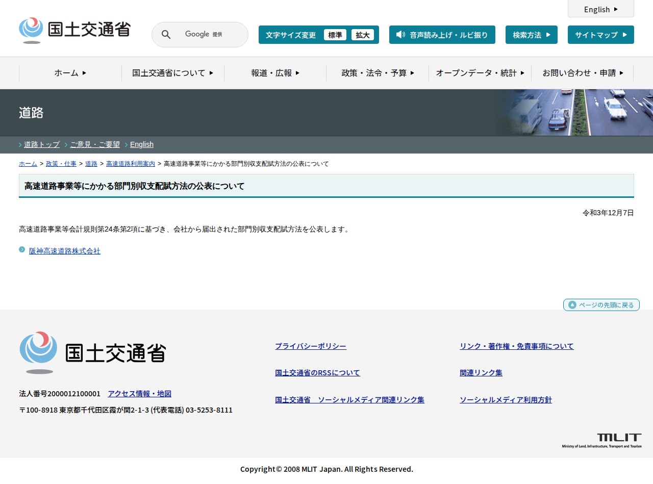道路:高速道路利用案内:高速道路事業等にかかる部門別収支配賦方法の公表について - 国土交通省
