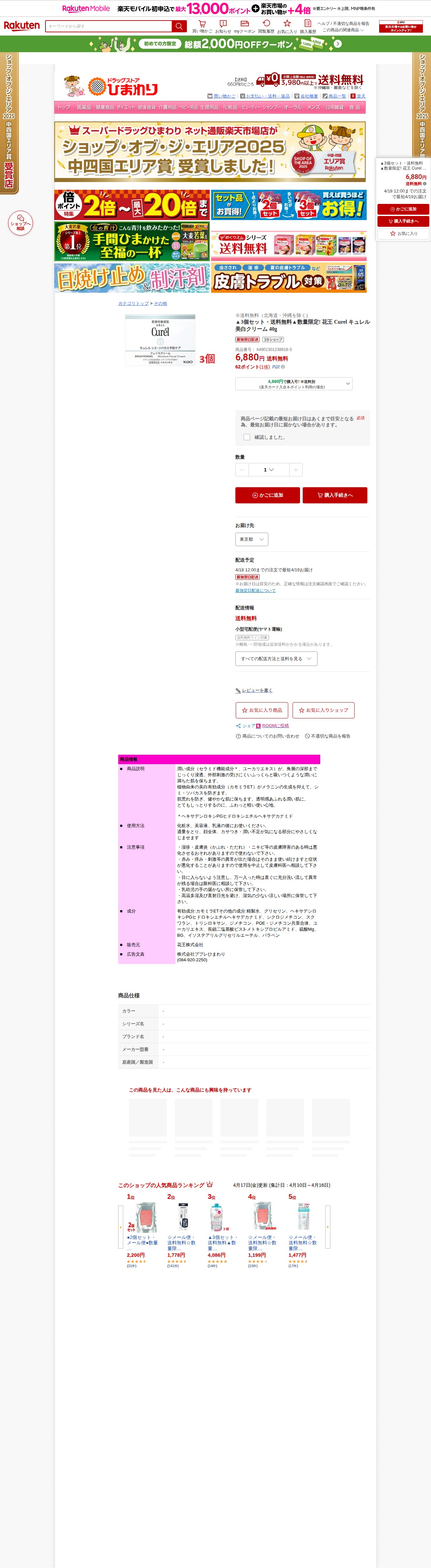 【楽天市場】▲3個セット・送料無料▲数量限定! 花王 Curel キュレル 美白クリーム 40g:ドラッグストアひまわり - 保存されたスクリーンショット