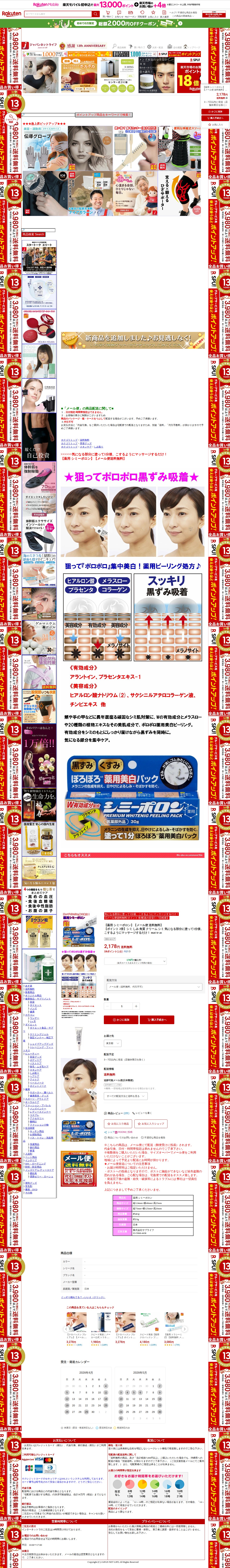 このページは、楽天市場で販売されている薬用シミーポロンという薬用シミ・角質クリームの商品ページです。気になる部分に塗って1分後にマッサージするだけで使用でき、価格は2,178円で送料無料です。メール便での配送となり、3~7日以内の発送予定です。ポイント2倍対象商品で、代金引換と日付・時間帯指定には対応していません。
