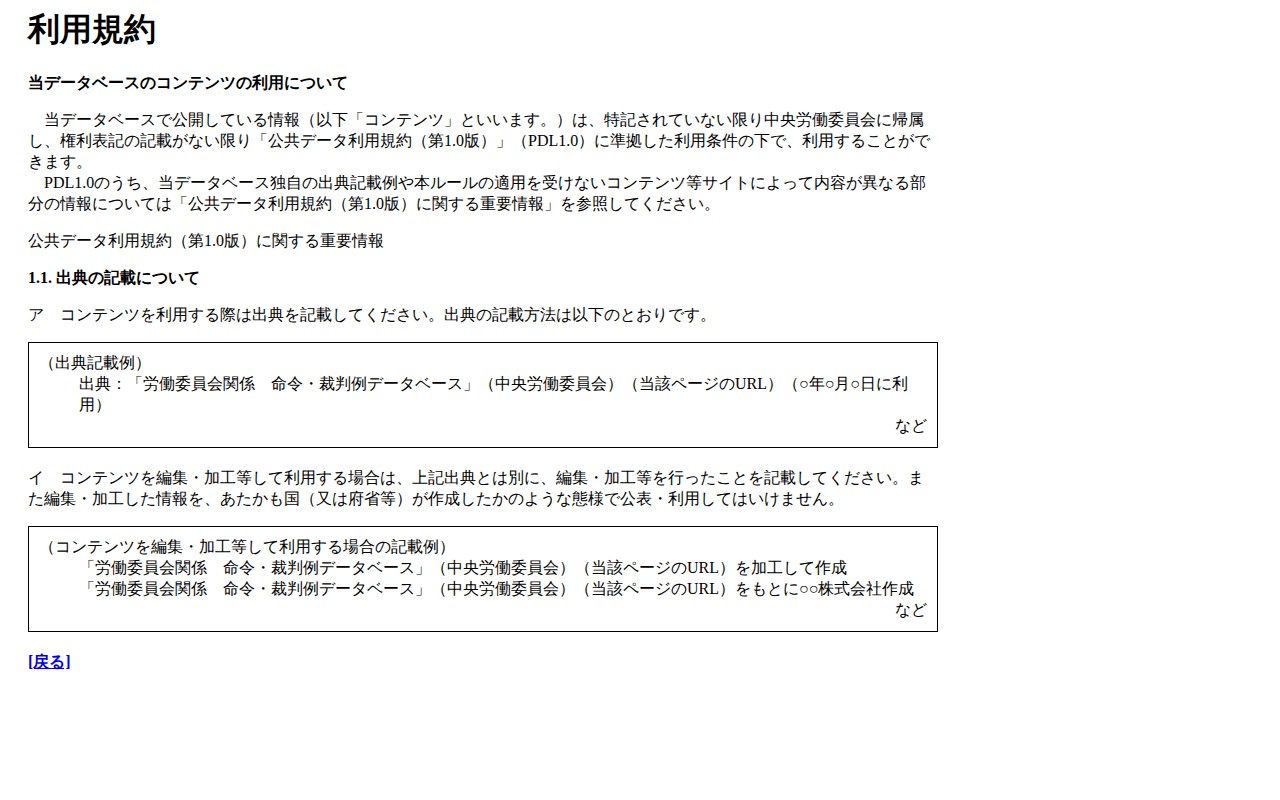 このページは、中央労働委員会が公開する「労働委員会関係命令・裁判例データベース」のコンテンツ利用規約を説明しています。公開情報は「公共データ利用規約(第1.0版)」に準拠した条件で利用可能です。利用時は出典を記載し、編集・加工した場合はその旨を明記する必要があります。加工情報を国の作成物として公表することは禁止されています。