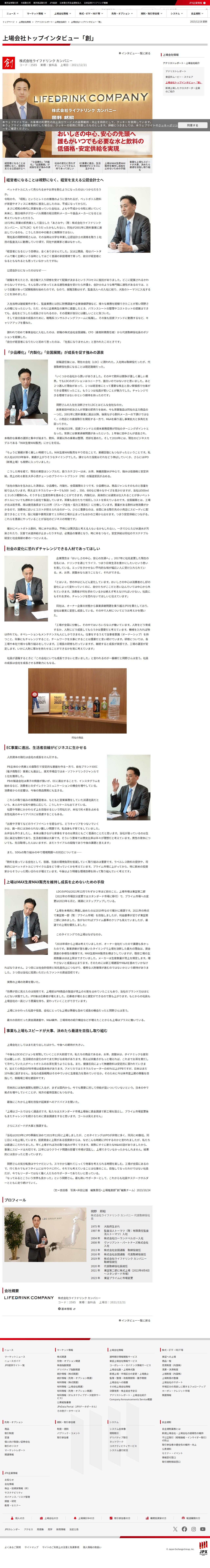このページは、日本取引所グループが運営する上場会社トップインタビュー「創」で、食料品業の株式会社ライフドリンク カンパニー(コード:2585)の経営者・岡野邦昭社長のインタビューを掲載しています。昭和の茶葉卸売業から平成に飲料事業へ進出した同社の成長戦略や、岡野社長の公認会計士から経営者へのキャリア形成、「少品種化」「内製化」「全国展開」による競争力強化、EC事業進出、上場による成長加速などについて紹介しています。