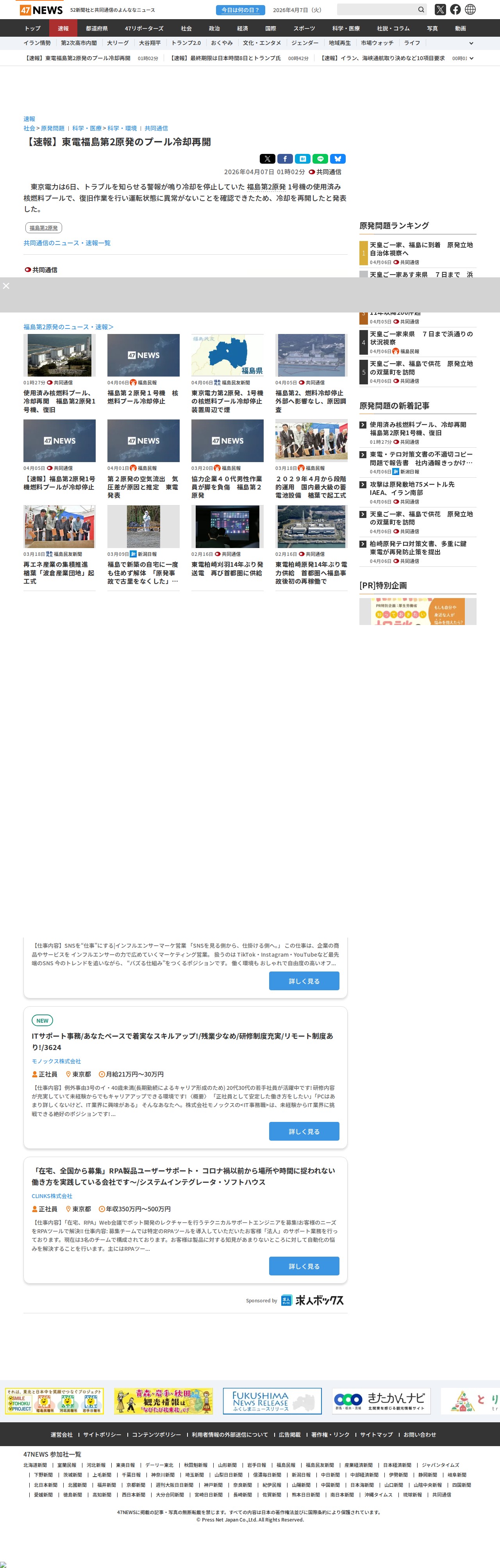 【速報】東電福島第2原発のプール冷却再開|47NEWS(よんななニュース)