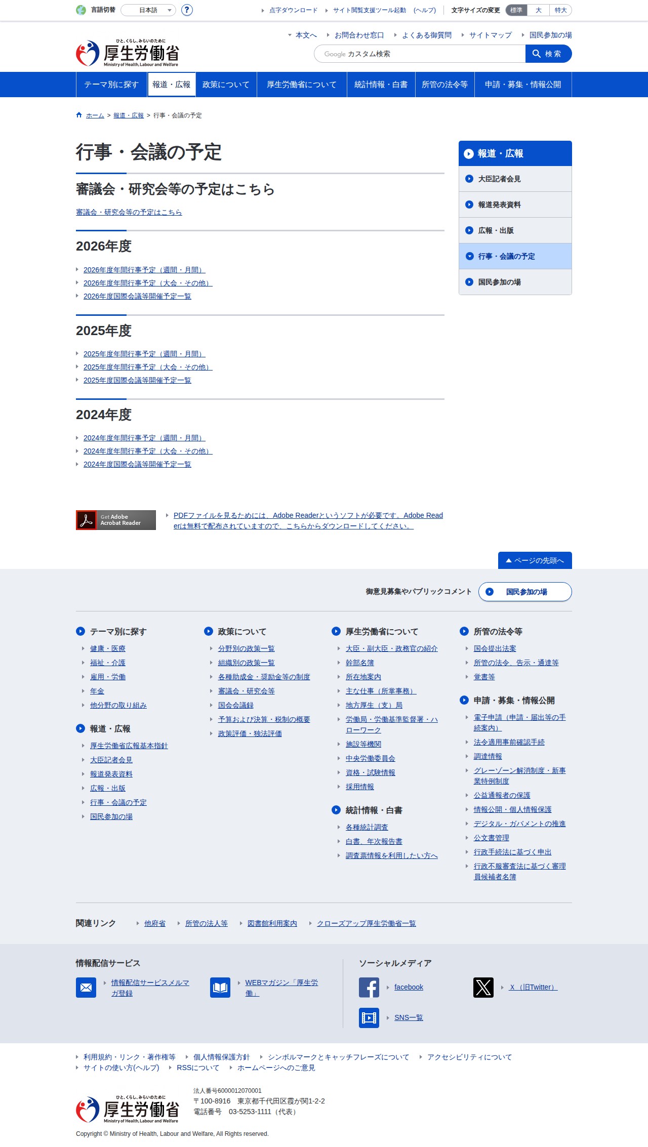 このページは厚生労働省の行事・会議の予定を掲載するページです。審議会・研究会等の予定情報へのリンクを提供しており、2024年度から2026年度の年間行事予定(週間・月間、大会・その他)および国際会議等開催予定一覧がPDF形式で公開されています。また、報道・広報、政策情報、統計情報、法令情報、申請・募集情報など、厚生労働省の各種情報へのアクセスポイントとしても機能しています。
