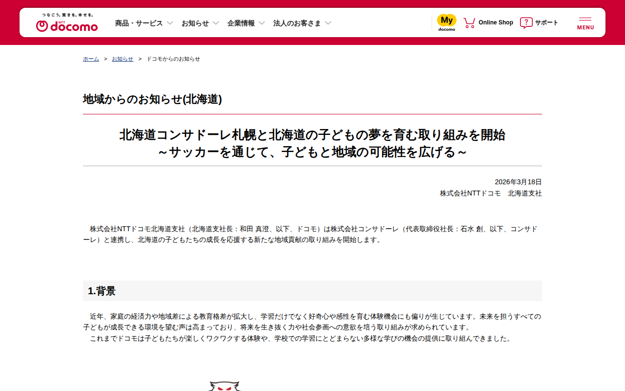 北海道コンサドーレ札幌と北海道の子どもの夢を育む取り組みを開始~サッカーを通じて、 子どもと地域の可能性を広げる~| お知らせ | NTTドコモ