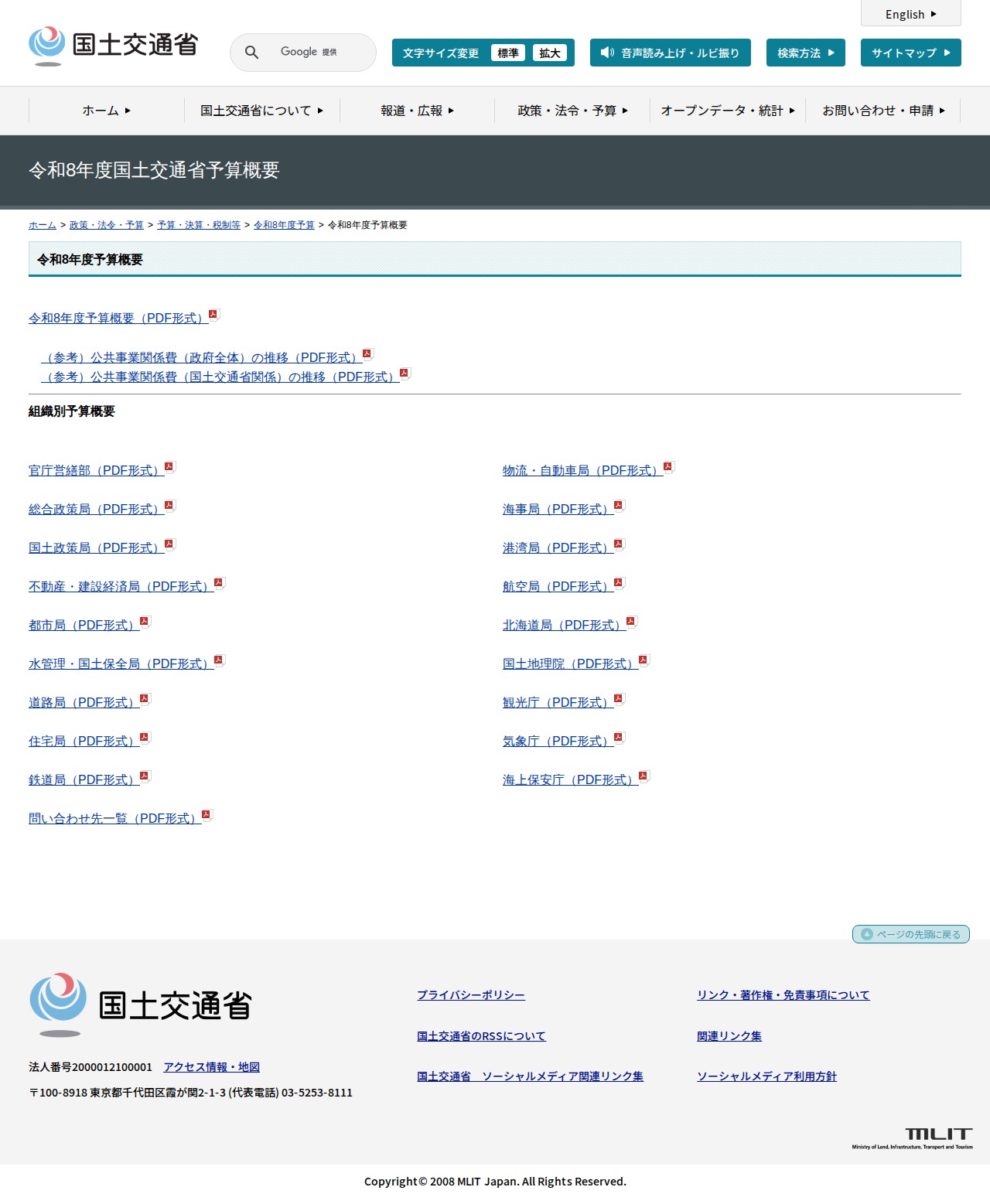 このページは、令和8年度の国土交通省予算概要を掲載しています。予算概要のPDF資料、公共事業関係費の推移データ、そして官庁営繕部、総合政策局、国土政策局、不動産・建設経済局、都市局、水管理・国土保全局、道路局、住宅局、鉄道局、物流・自動車局、海事局、港湾局、航空局、北海道局、国土地理院、観光庁、気象庁、海上保安庁などの各部局別の予算概要がPDF形式で提供されています。また、問い合わせ先一覧も掲載されています。