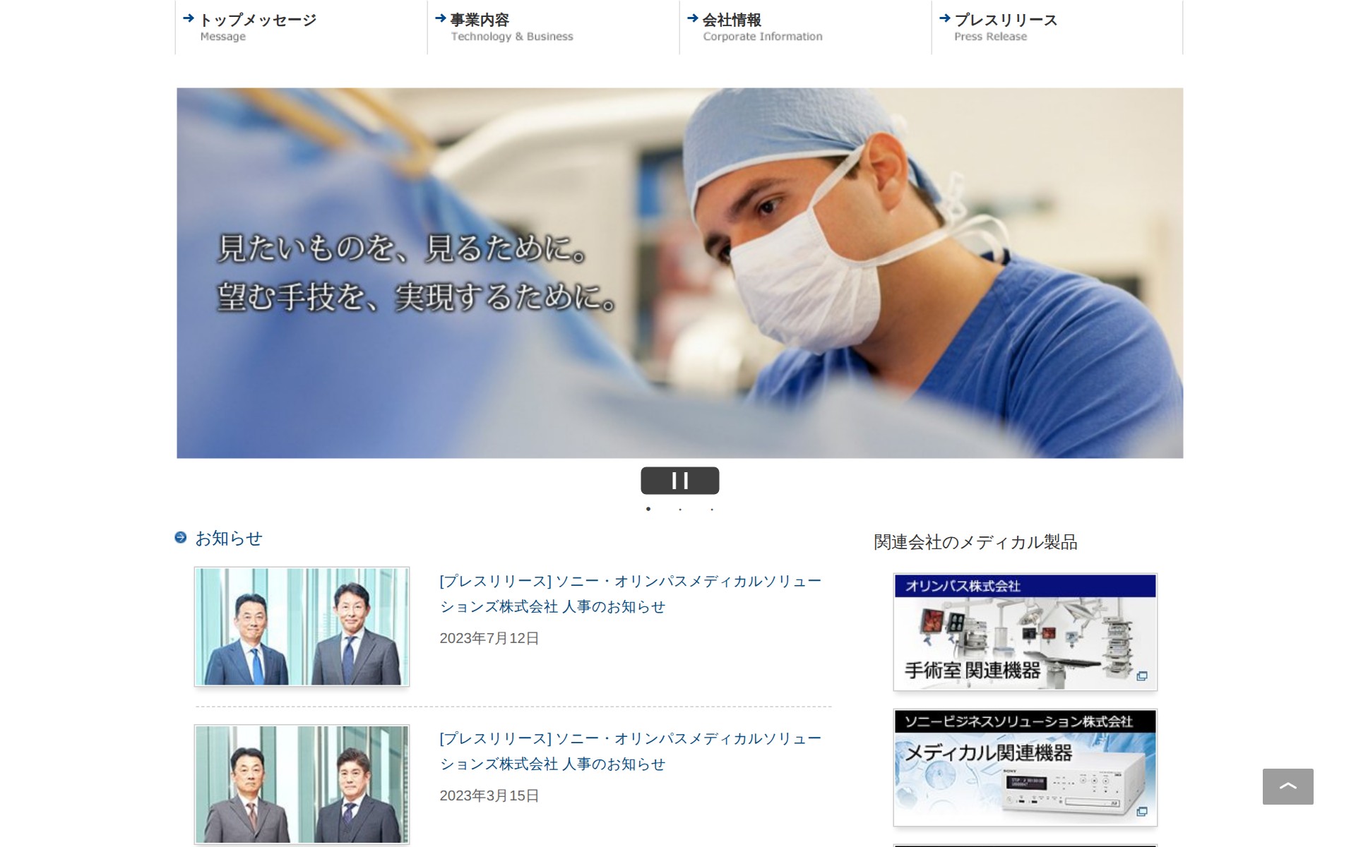 このページはソニー・オリンパスメディカルソリューションズ株式会社の公式ウェブサイトです。同社は医療機器の開発・製造を行う企業で、トップメッセージ、事業内容、会社情報などの情報を提供しています。プレスリリースセクションでは、人事異動や製品開発に関する複数の発表が掲載されており、4K・3D対応の外科手術用内視鏡システムや手術用顕微鏡システムなどの開発実績が紹介されています。また、医療機関との関係透明性に関する指針も制定しており、企業の社会的責任を示しています。