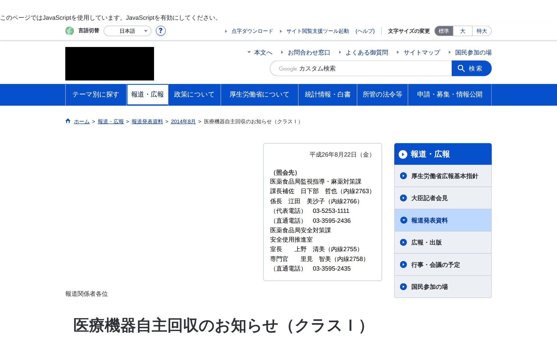 医療機器自主回収のお知らせ(クラスI)|厚生労働省