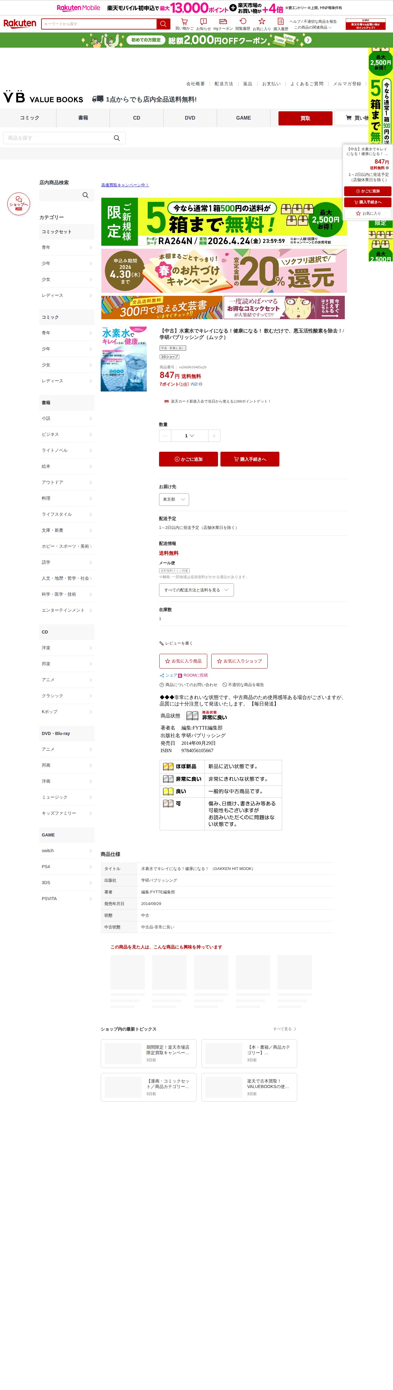 このページは、楽天市場でVALUE BOOKSが販売している中古ムック本「水素水でキレイになる!健康になる!」の商品ページです。学研パブリッシング発行、2014年9月29日発売で、ISBN番号は9784056105667。価格は847円で送料無料、1~2日以内の発送予定です。商品状態は「非常に良い」中古品で、在庫は1冊です。楽天カード新規入会で2,000ポイント獲得可能なキャンペーンも実施中です。