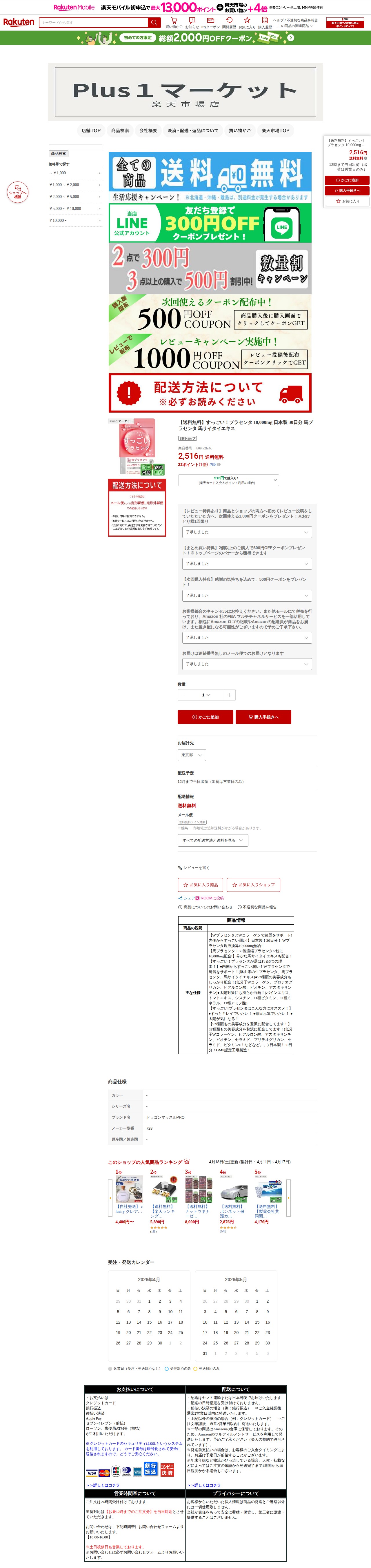 このページは、楽天市場で販売されている「すっごい!プラセンタ」のサプリメント商品ページです。馬プラセンタと濃縮プラセンタを配合した30日分の日本製サプリで、2粒に10,000mg相当のプラセンタ成分が含まれています。価格は2,516円で送料無料。低分子コラーゲンやヒアルロン酸、アスタキサンチンなど52種類の美容成分を配合し、肌の潤いや美容サポートを目的とした製品です。GMP認定工場で製造されており、当日出荷対応。