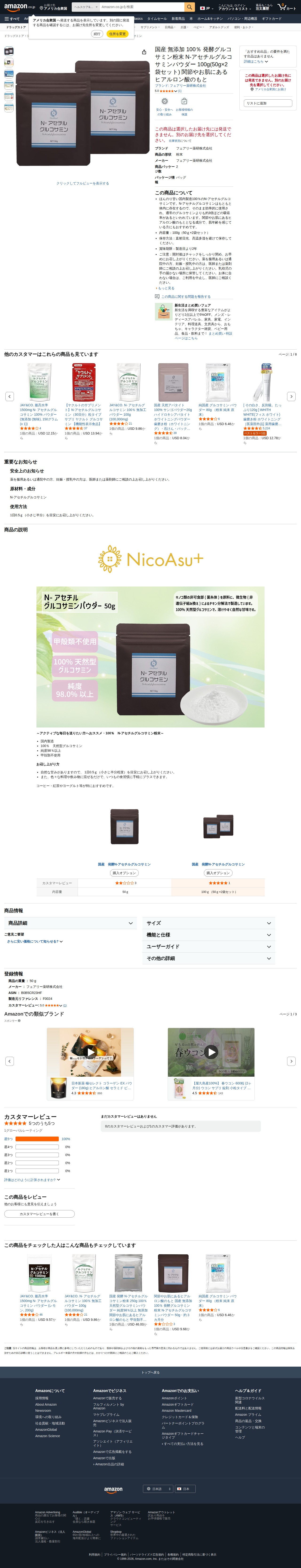 Amazon | 国産 無添加 100% 発酵グルコサミン粉末 N-アセチルグルコサミンパウダー 100g(50g×2袋セット) 関節やお肌にあるヒアルロン酸のもと | フェアリー薬研株式会社 | グルコサミン