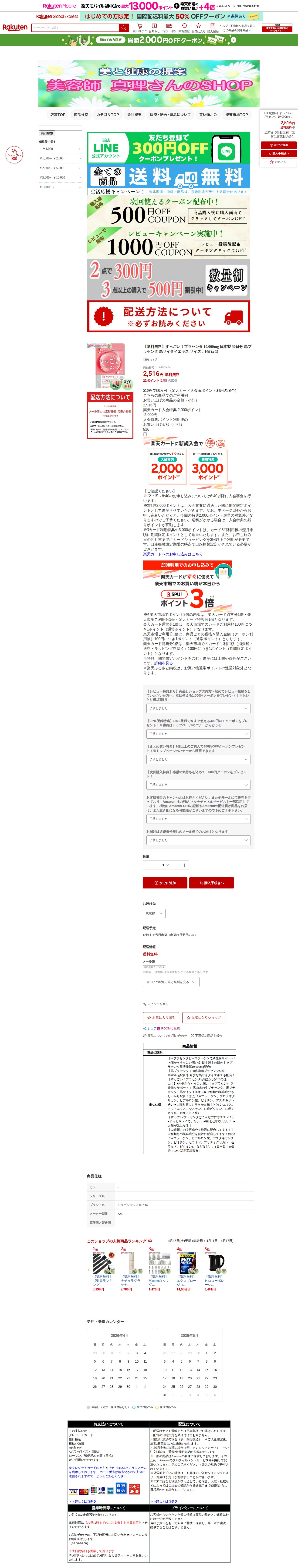 このページは、楽天市場で販売されている「すっごい!プラセンタ」という馬プラセンタサプリメントの商品ページです。10,000mg配合の30日分で、日本製です。価格は2,516円で送料無料。12時までの注文で当日出荷(営業日のみ)に対応しています。楽天カード入会で2,000ポイント特典があり、実質516円での購入が可能です。レビュー投稿で1,000円クーポン、LINE登録で300円オフクーポンなど複数の特典キャンペーンを実施しています。メール便での追跡番号なしの配送となります。
