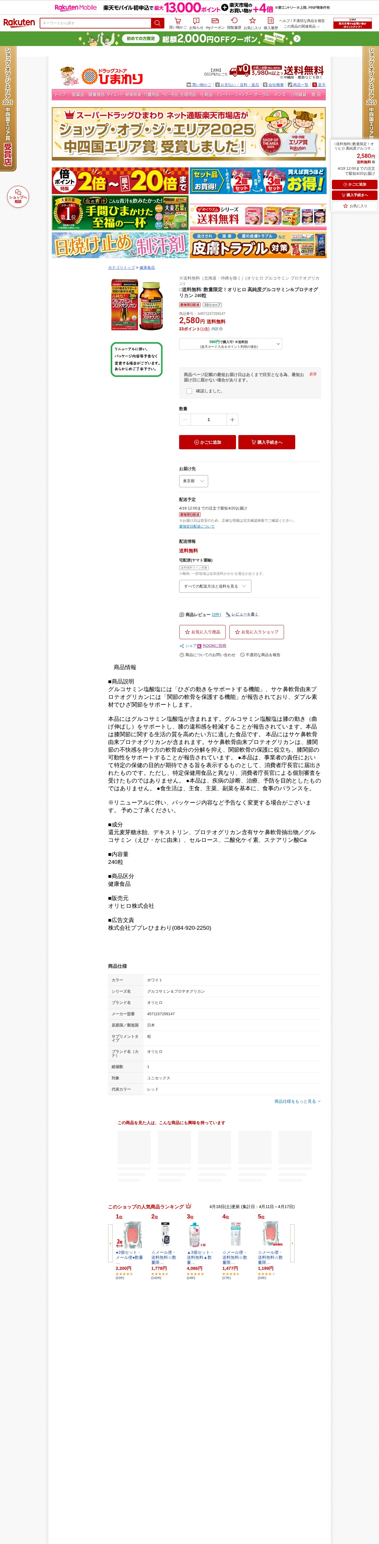 【楽天市場】□送料無料□数量限定!オリヒロ 高純度グルコサミン&プロテオグリカン 240粒:ドラッグストアひまわり
