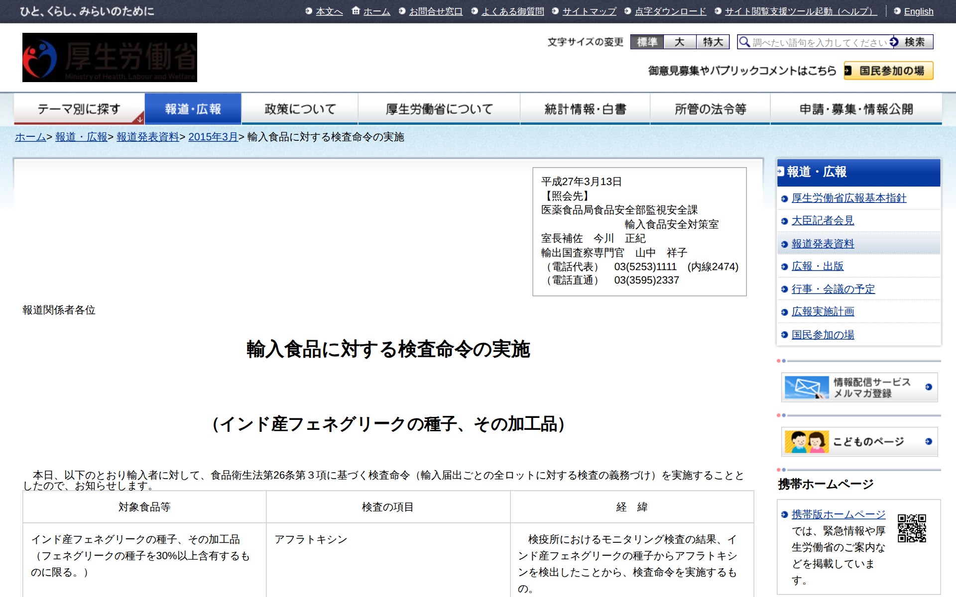 このページは、厚生労働省がインド産フェネグリークの種子およびその加工品に対する輸入検査命令の実施を発表した報道資料です。検疫所のモニタリング検査でアフラトキシン(発がん性を有するカビ毒)が検出されたため、食品衛生法に基づき、輸入届出ごとの全ロット検査を義務づけました。違反事例として、東京検疫所に到着したフェネグリークパウダー3バッグ(90kg)からアフラトキシンが基準値を超えて検出され、全量保管中です。