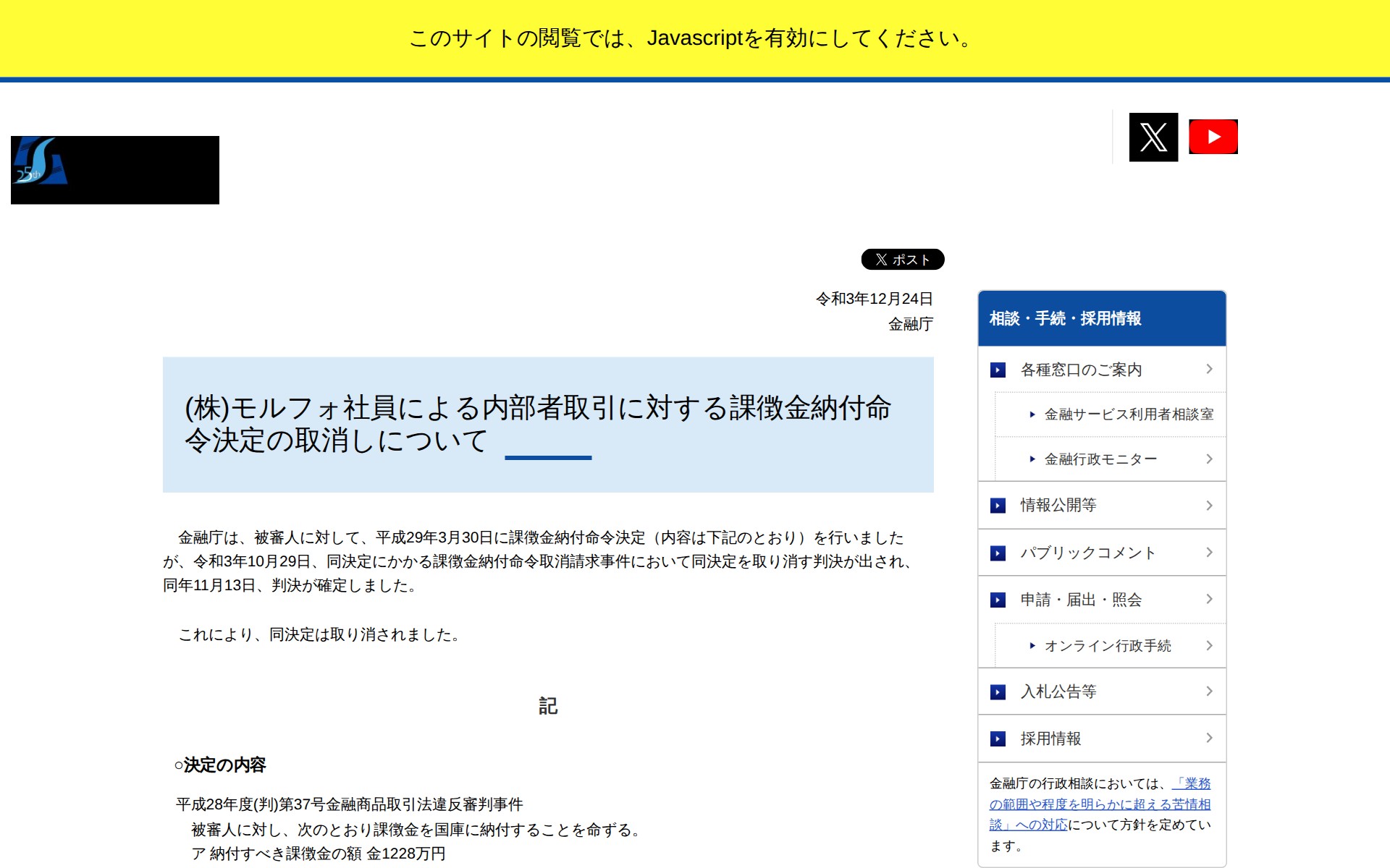 このページは、金融庁がモルフォ社員による内部者取引に対して平成29年3月30日に下した課徴金納付命令決定(1228万円の納付)が、令和3年10月29日の裁判所の判決により取り消されたことを報告しています。同年11月13日に判決が確定し、当該決定は正式に取り消されました。