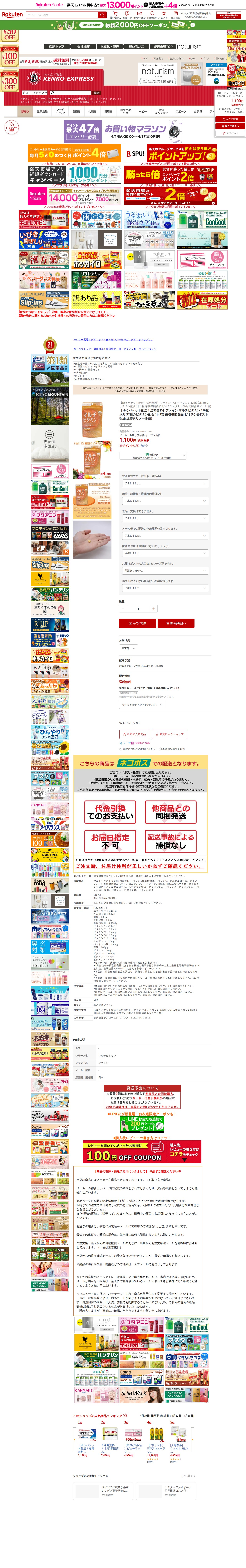 このページは、楽天市場で販売されているファイン マルチビタミンサプリメントの商品紹介ページです。120粒入り(120日分)で、12種類のビタミンを配合した栄養機能食品です。1日1粒を目安に摂取します。価格は1,100円で送料無料。ゆうパケット配送で、ポスト投函となります。食生活の偏りが気になる方向けの商品で、ビオチンを含む栄養機能食品として認定されています。