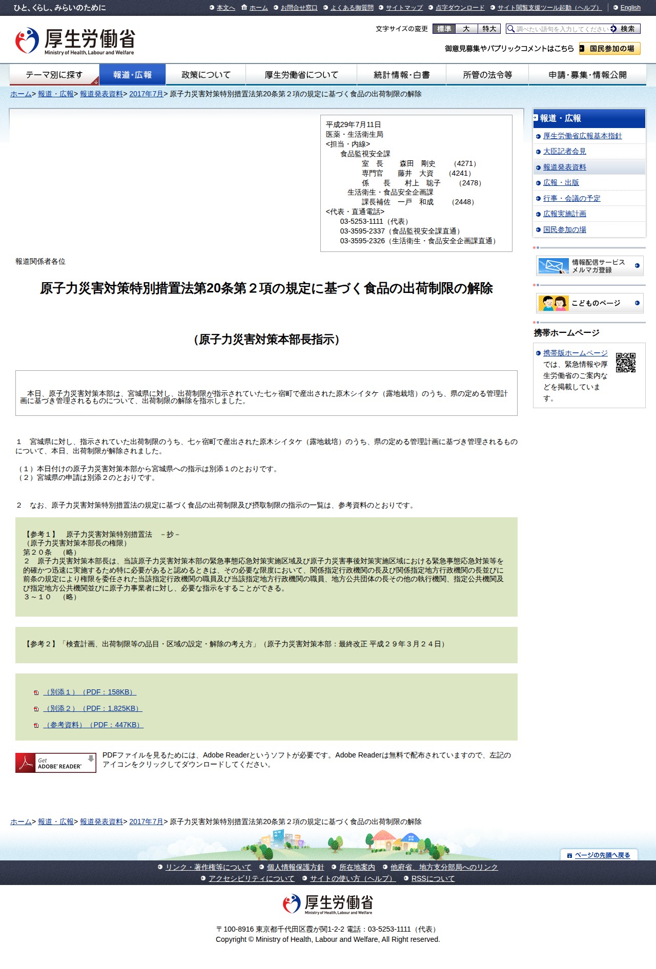 原子力災害対策特別措置法第20条第2項の規定に基づく食品の出荷制限の解除 |報道発表資料|厚生労働省