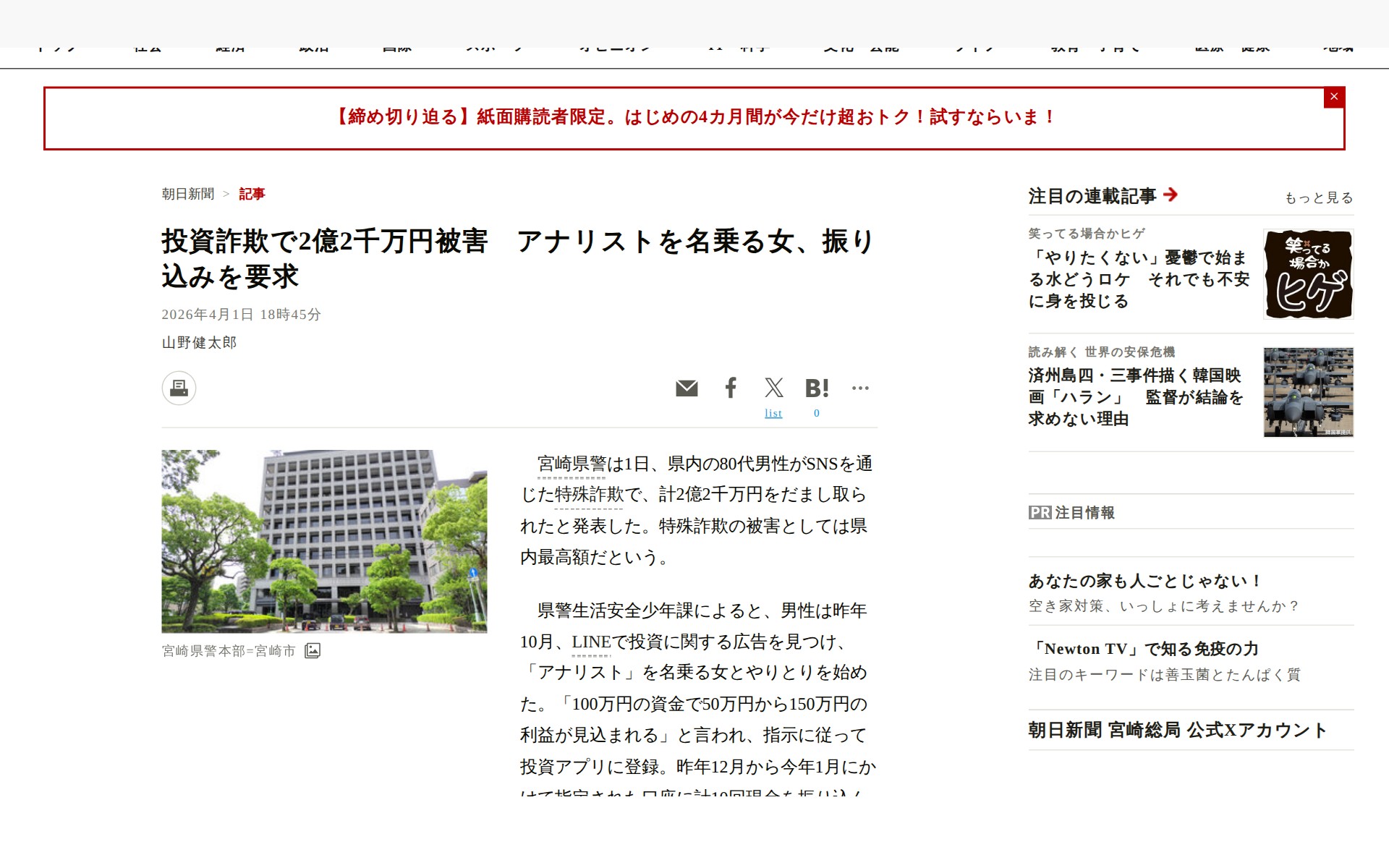 ![投資詐欺で2億2千万円被害 アナリストを名乗る女、振り込みを要求 [宮崎県]:朝日新聞 - 保存されたスクリーンショット](https://pub-f6fa8ca7bebe4069bff3224f9a8f5334.r2.dev