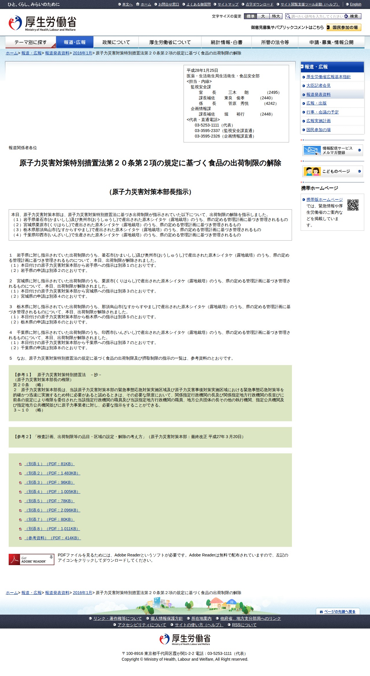 原子力災害対策特別措置法第20条第2項の規定に基づく食品の出荷制限の解除 |報道発表資料|厚生労働省