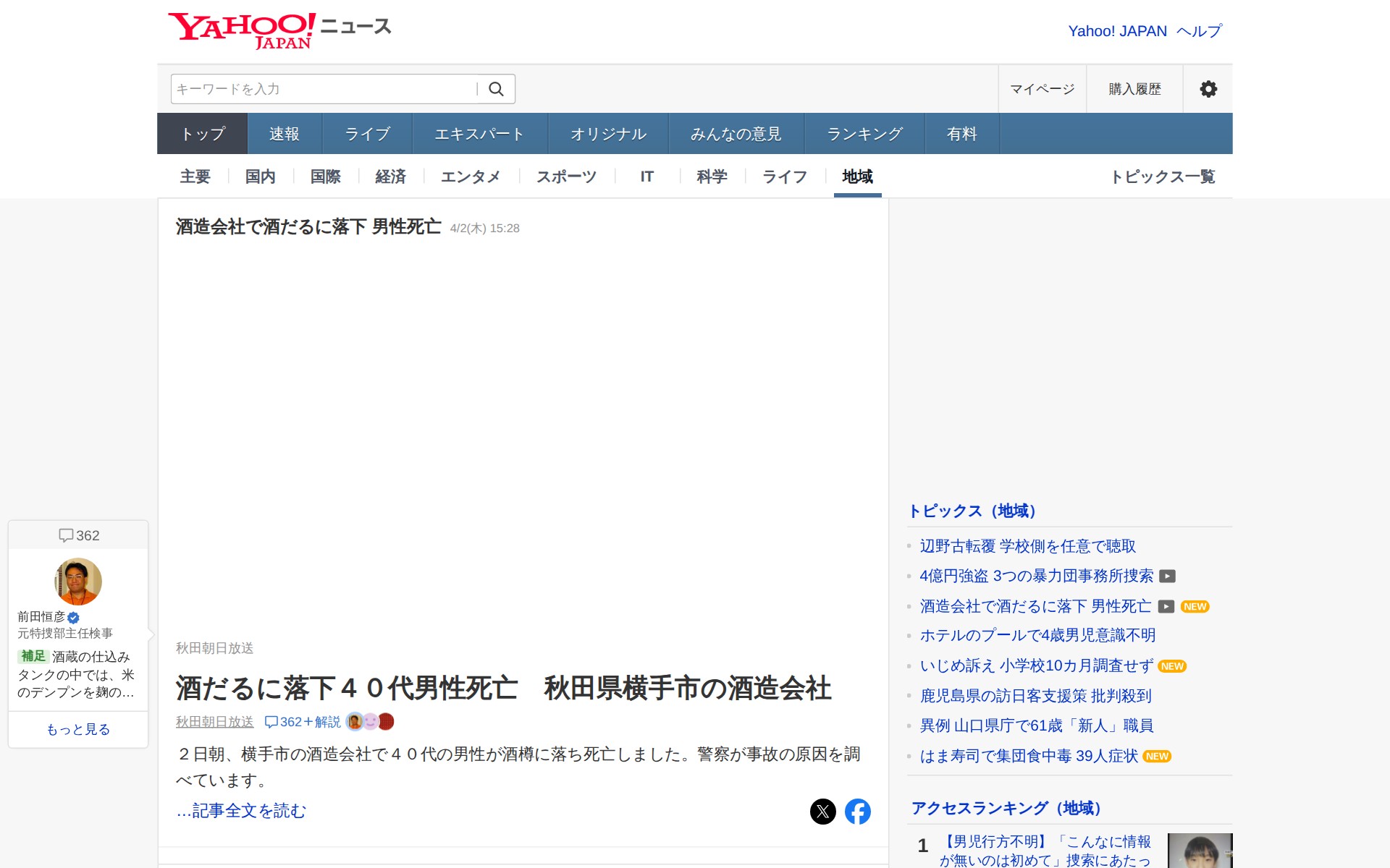 このページは、秋田県横手市の酒造会社で4月2日朝に発生した事故のニュースを報じています。40代の男性が酒樽に落下して死亡しました。警察が事故の原因を調査中です。記事にはコメント欄があり、酒造業界の安全対策の重要性について議論されています。また、酒蔵の発酵タンク内での糖化と発酵プロセスの説明も含まれており、設備の近代化に関する指摘もあります。