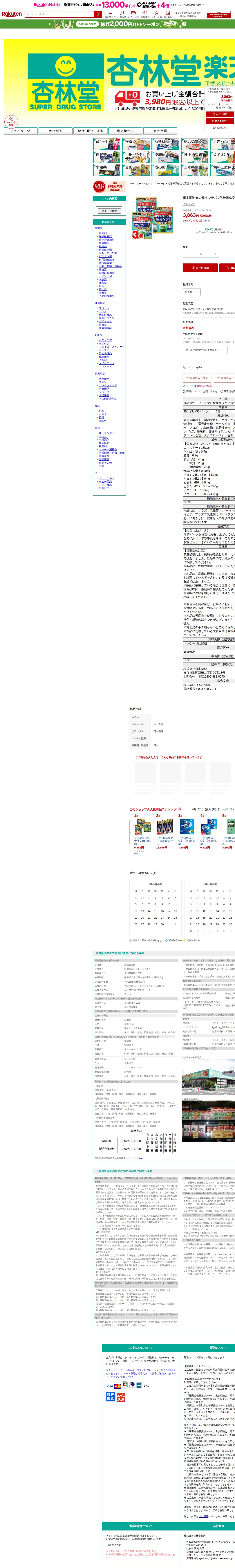 このページは、楽天市場で販売されている日本薬健の「金の青汁 プラズマ乳酸菌免疫ケア青汁」の商品ページです。30包×3個入りで3,863円、送料無料で購入できます。大麦若葉やケール、プラズマ乳酸菌を含む機能性表示食品で、免疫機能の維持に役立つとされています。1日2パックを目安に水や牛乳に溶かして摂取します。栄養成分としてビタミン類や食物繊維を含有しており、疾病治療を目的としない健康食品です。